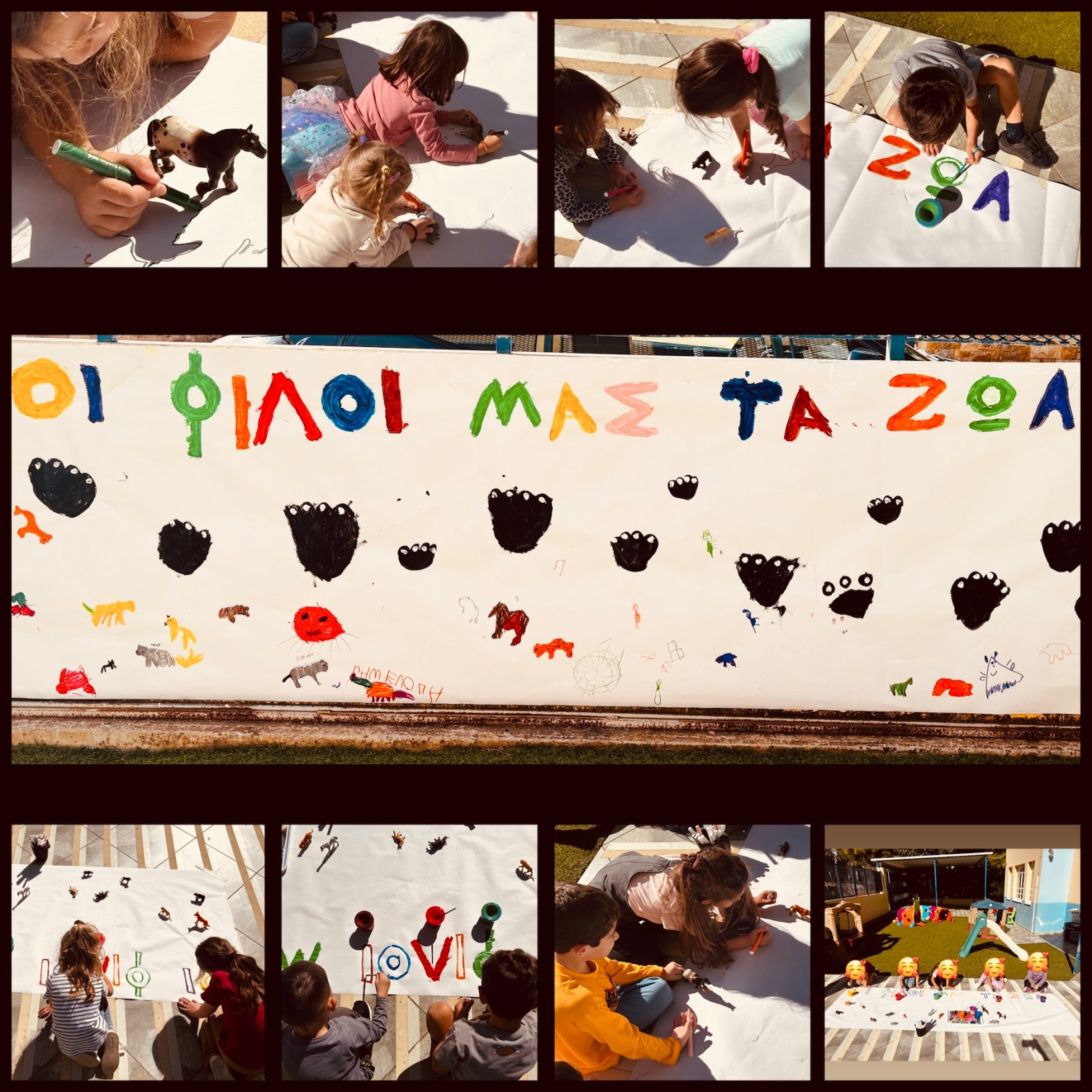 Τα παιδιά χρωμάτισαν τα γράμματα με φαντασία και χρώματα, ζωγράφισαν ζωάκια και αποτύπωσαν πατουσάκια, δημιουργώντας έναν πολύχρωμο πίνακα γεμάτο ζωντάνια και αγάπη. Στολίσαμε το πανό στον τοίχο της αυλής μας και το μοιραστήκαμε με όλους!