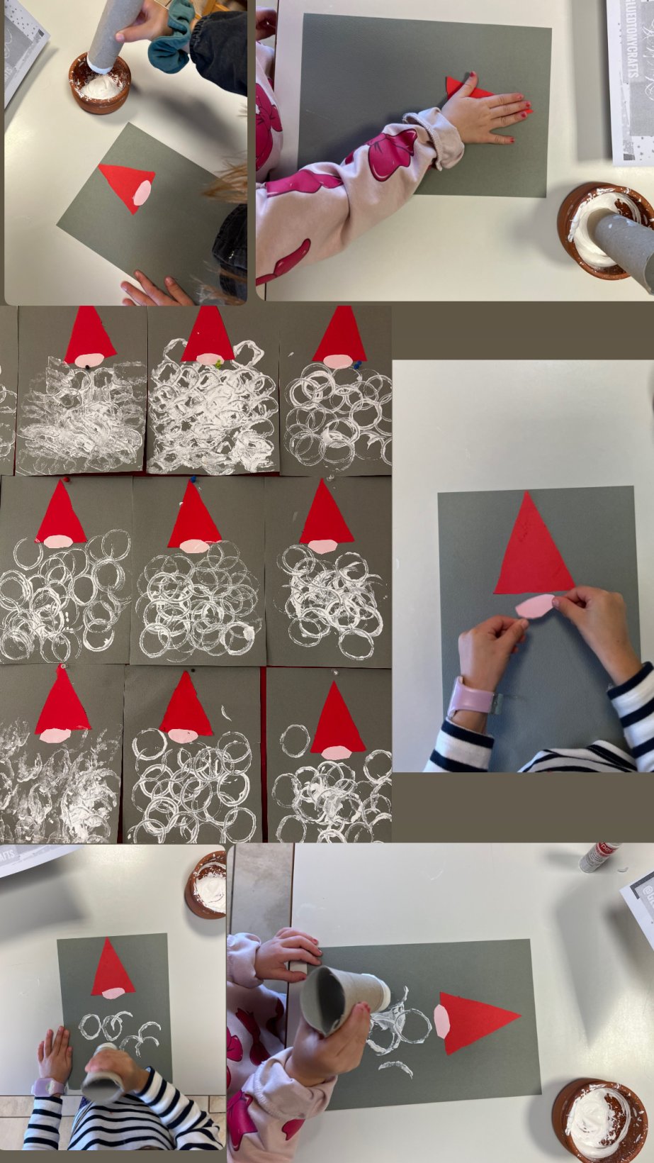 Επίσης, φτιάξαμε έναν χαριτωμένο Αϊ-Βασίλη με ρολό χαρτιού υγείας. Τα παιδιά δημιούργησαν τα γένια του βουτώντας το ρολό σε άσπρη μπογιά, σχηματίζοντας μια όμορφη υφή. Στη συνέχεια έκοψαν από χαρτόνι το τριγωνικό του καπέλο και μια στρογγυλή μυτούλα και τα κόλλησαν όλα μαζί, ολοκληρώνοντας έτσι τον δικό τους ξεχωριστό Αϊ-Βασίλη.
