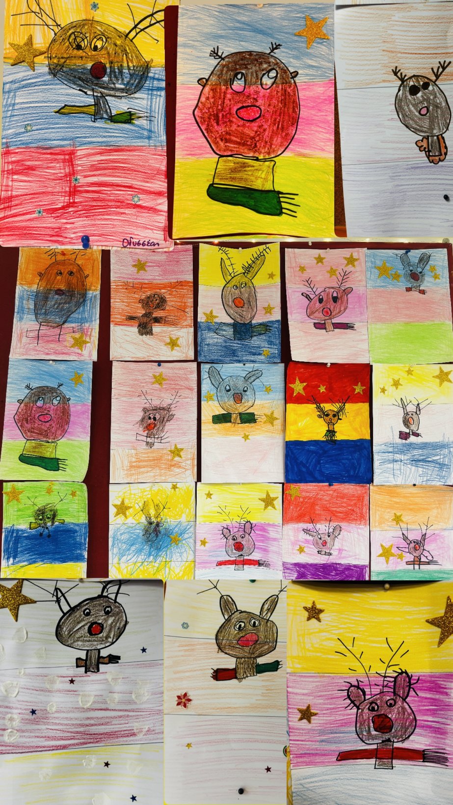 Στη συνέχεια, κάθε παιδί έφτιαξε τον δικό του Ρούντολφ το ελαφάκι με τη μέθοδο της καθοδηγούμενης ζωγραφικής. Βήμα βήμα τους δείξαμε τη διαδικασία ώστε να δουν πώς από απλά σχήματα μπορεί να δημιουργηθεί ένας αγαπημένος χριστουγεννιάτικος φίλος. Αρχικά έβαψαν το φόντο με ξυλομπογιές, έπειτα σχεδίασαν με μαύρο μαρκαδόρο το περίγραμμα του Ρούντολφ και στο τέλος χρωμάτισαν με κηρομπογιές τη μύτη, τα αυτιά και το πρόσωπό του.