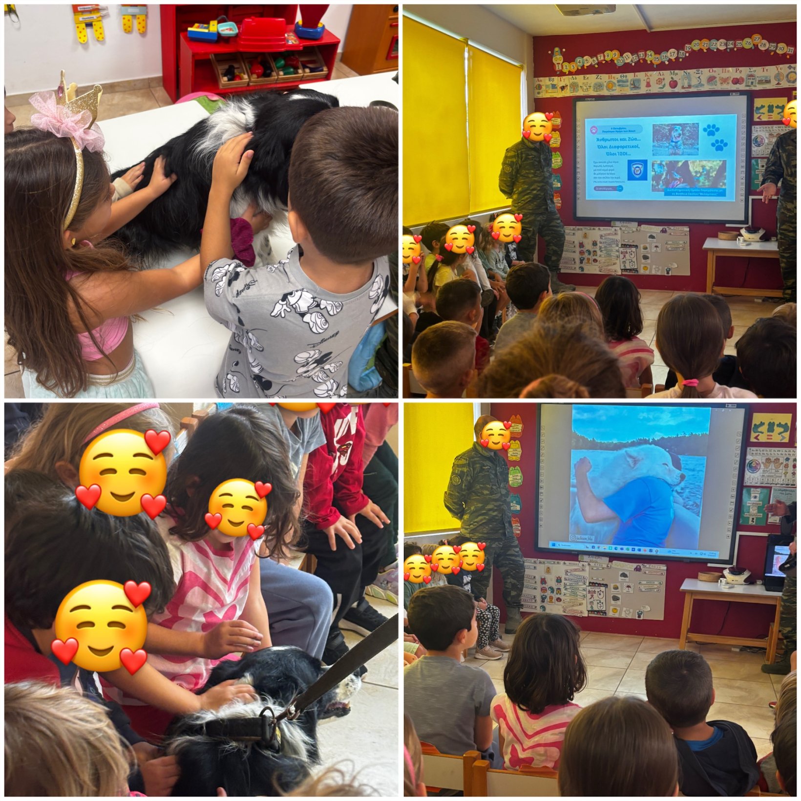 Οι κύριοι Χανιωτάκης (αξιωματικός της Πολεμικής Αεροπορίας), Παπαγεωργίου (εκπαιδευτής ζώων) και Διαμαντάκος (συμπεριφοριστής ζώων) μίλησαν στα παιδιά μας για την ανιδιοτελή αγάπη που προσφέρουν τα ζώα, αλλά και για τη σπουδαία βοήθεια που παρέχουν σε ανθρώπους που το έχουν ανάγκη — όπως παιδιά με αναπηρίες ή παιδιά που νοσηλεύονται σε νοσοκομεία.