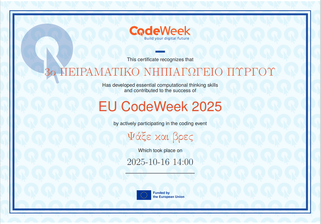 Και φυσικά, στο τέλος, λάβαμε και το πιστοποιητικό συμμετοχής μας στην Code Week 2025! Ένα ακόμη όμορφο βήμα στο ταξίδι της γνώσης και της καινοτομίας!