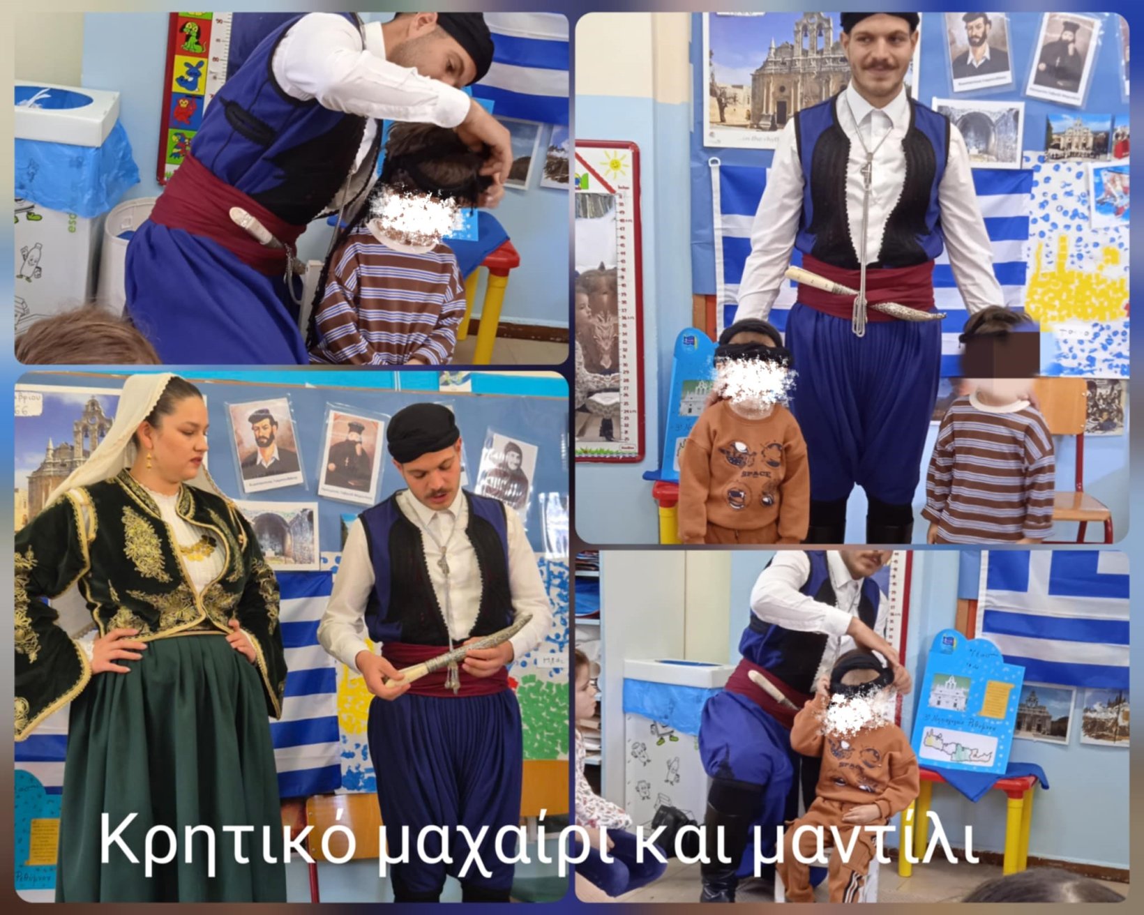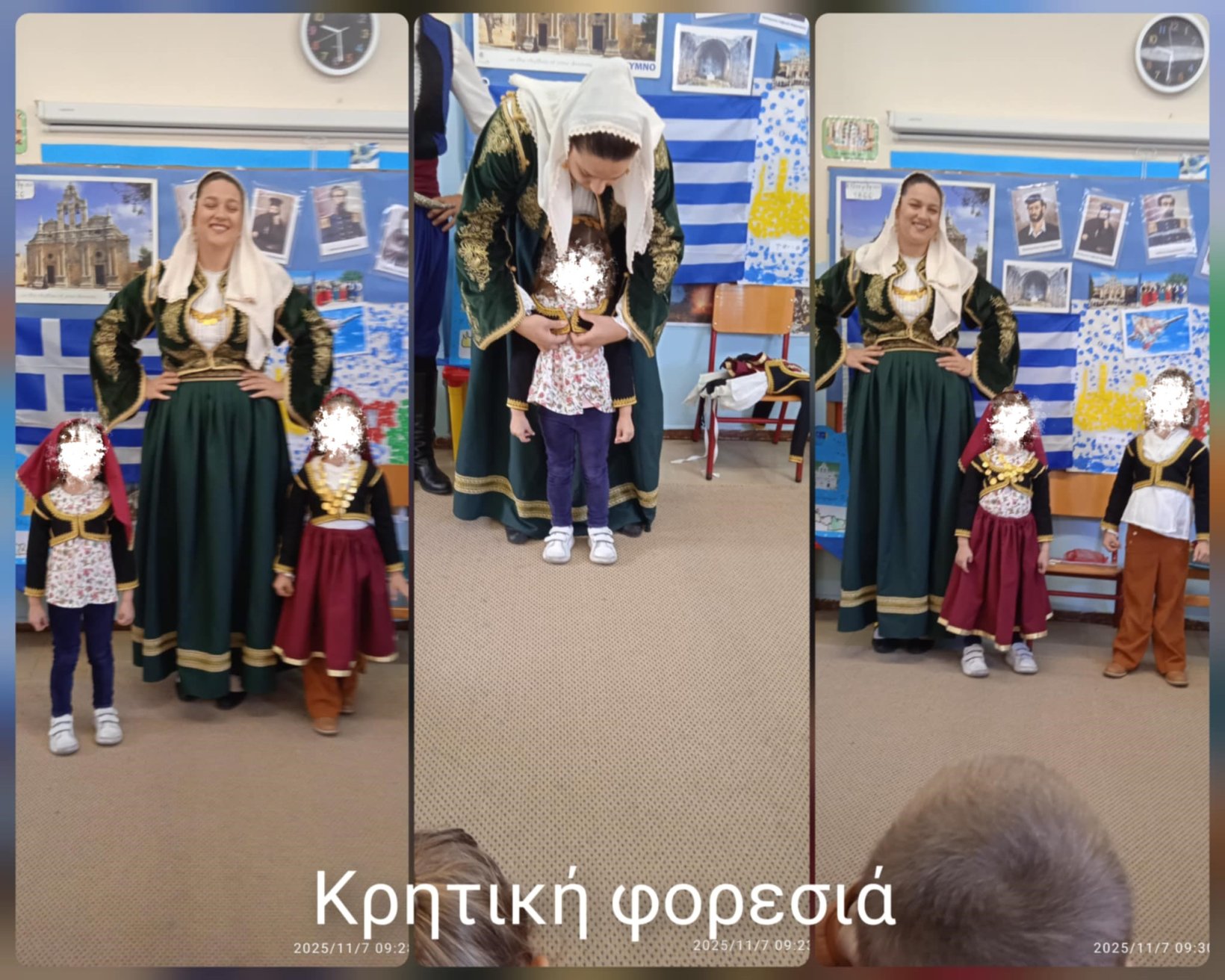 Την Παρασκευή 7 Νοεμβρίου 2025 ήρθαν στο σχολείο μας η Μαρία Σαριδάκη και ο Μανώλης Παπαδάκης, μέλη του Λαογραφικού Ομίλου “Χοροκρήτες” και μας παρουσίασαν στοιχεία της παράδοσης της Κρήτης μας.Την ξεχωριστή κρητική φορεσιά, το μαντίλι , το μαχαίρι σύμβολα της παράδοσης και του τρόπου ζωής του λαού μας που κρατούν ζωντανά τα μέλη του Ομίλου και μεταλαμπαδεύουν στις επόμενες γενιές με μεράκι και αγάπη.