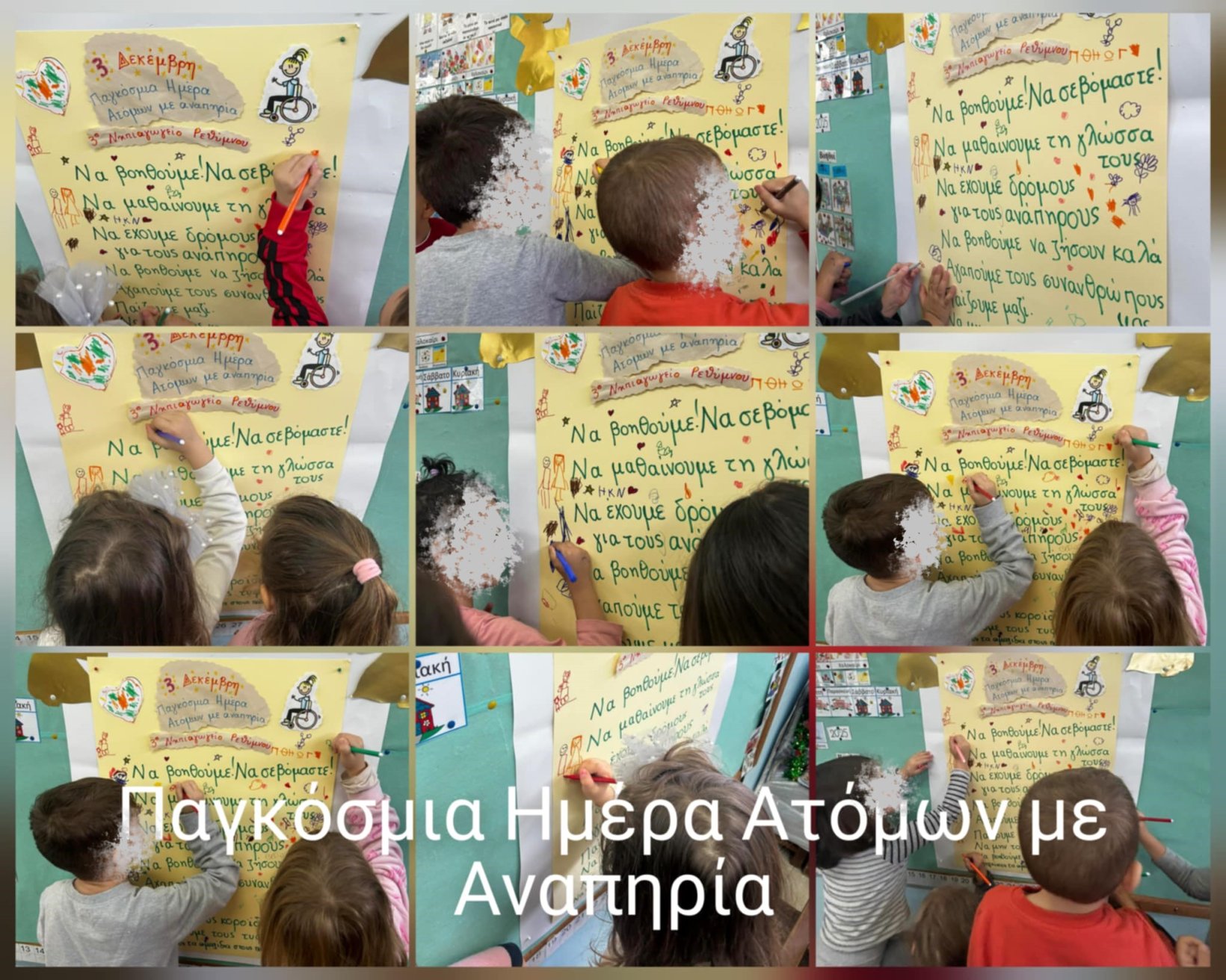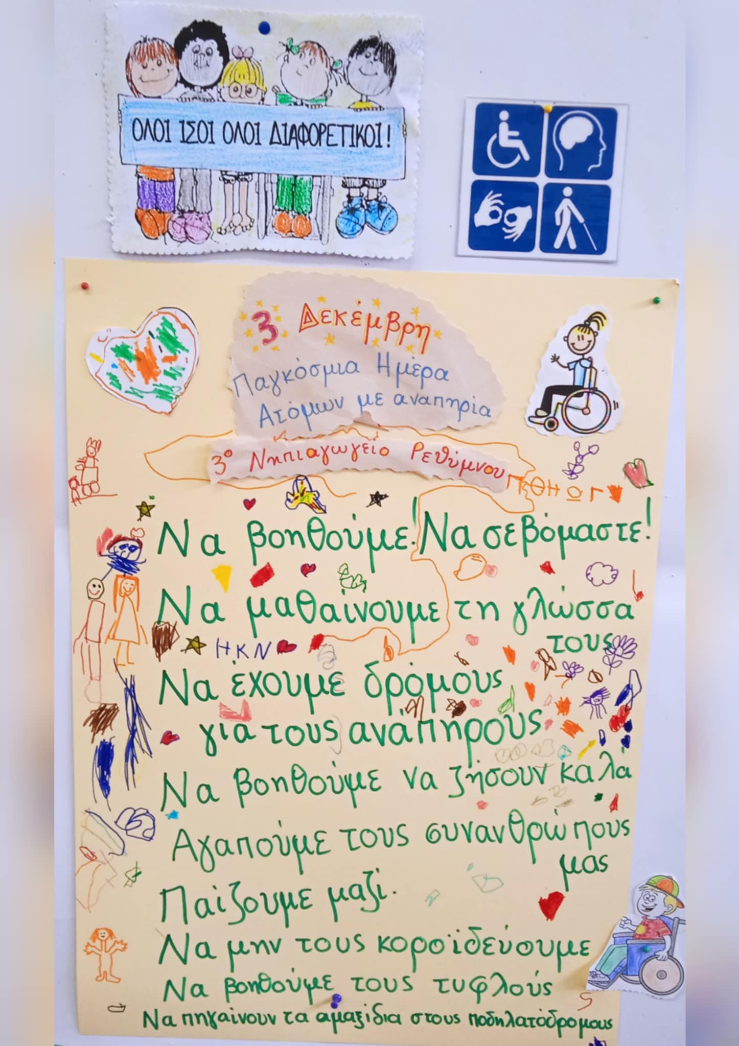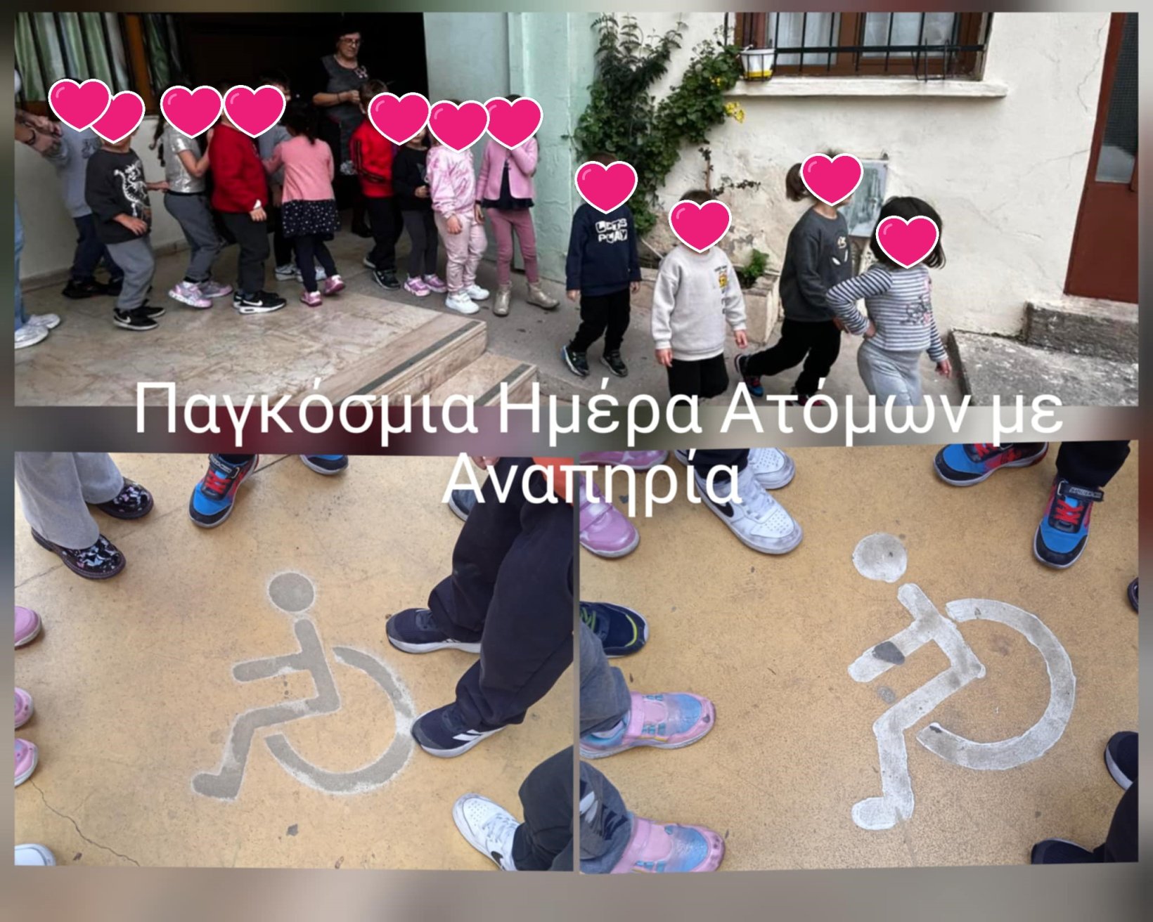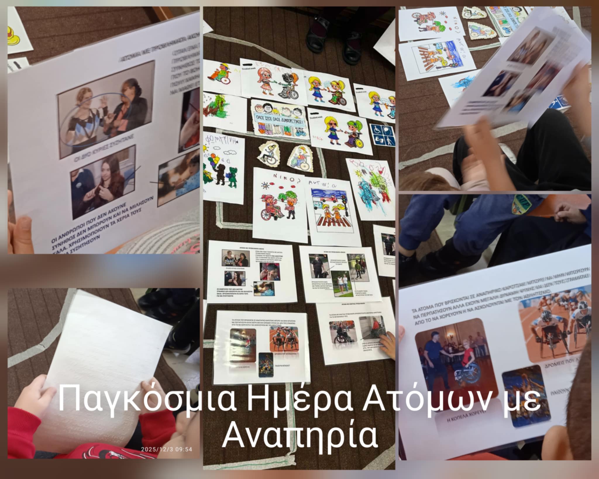Η Παγκόσμια Ημέρα Ατόμων με Αναπηρία (3 Δεκεμβρίου) θεσπίστηκε και τηρείται παγκόσμια από τα Ηνωμένα Έθνη το 1992. Εορτάζεται σε όλον τον Πλανήτη προωθώντας την κατανόηση σε θέματα αναπηρίας και την κινητοποίηση υπέρ των δικαιωμάτων αξιοπρέπειας και ευημερίας των ατόμων με αναπηρία. Επιδιώκει την αύξηση του βαθμού ένταξης των ατόμων με αναπηρία σε κάθε πτυχή της πολιτικής, κοινωνικής, οικονομικής και πολιτιστικής ζωής. (πηγή: https://el.wikipedia.org/wiki)