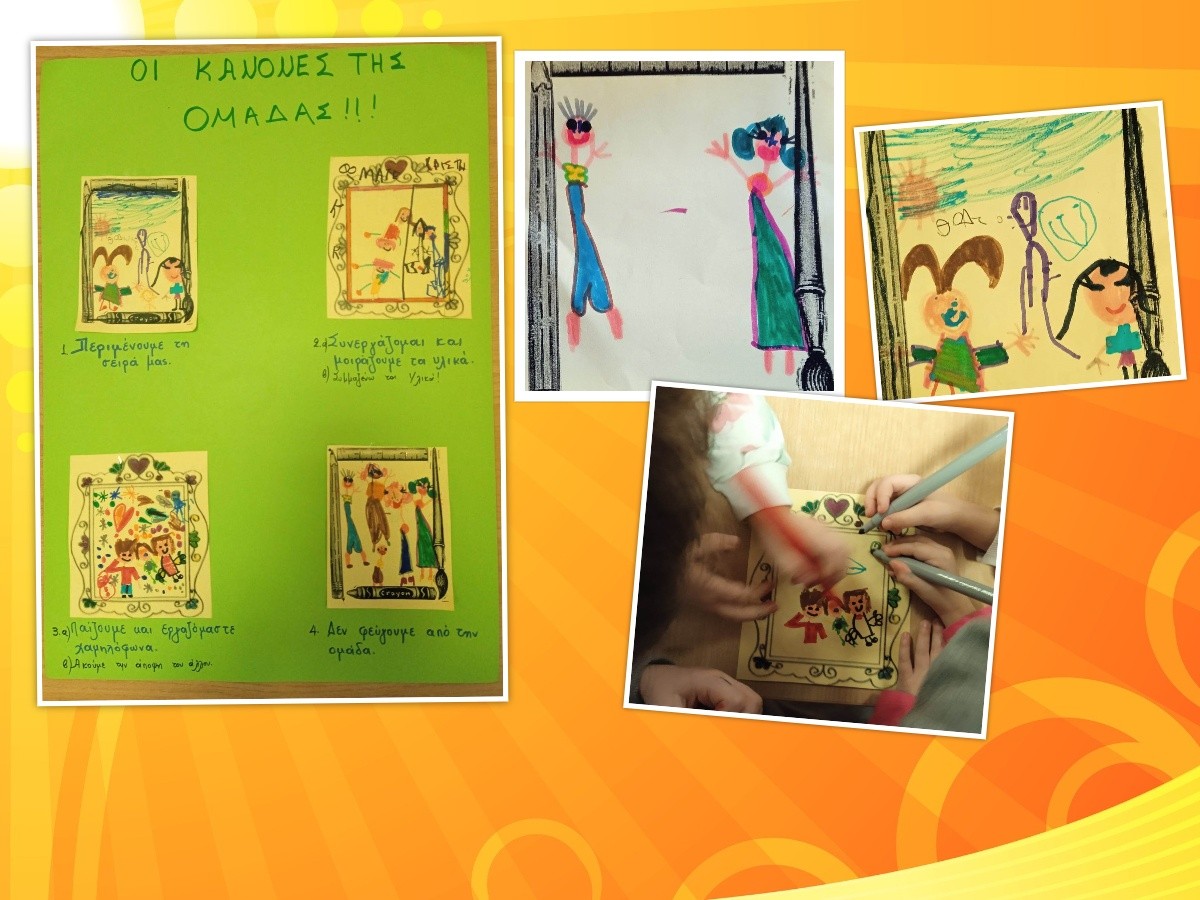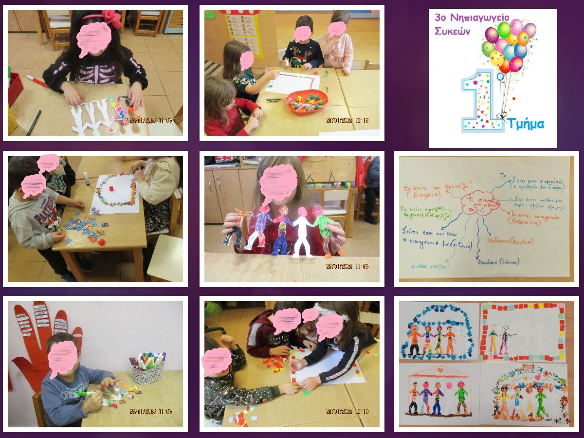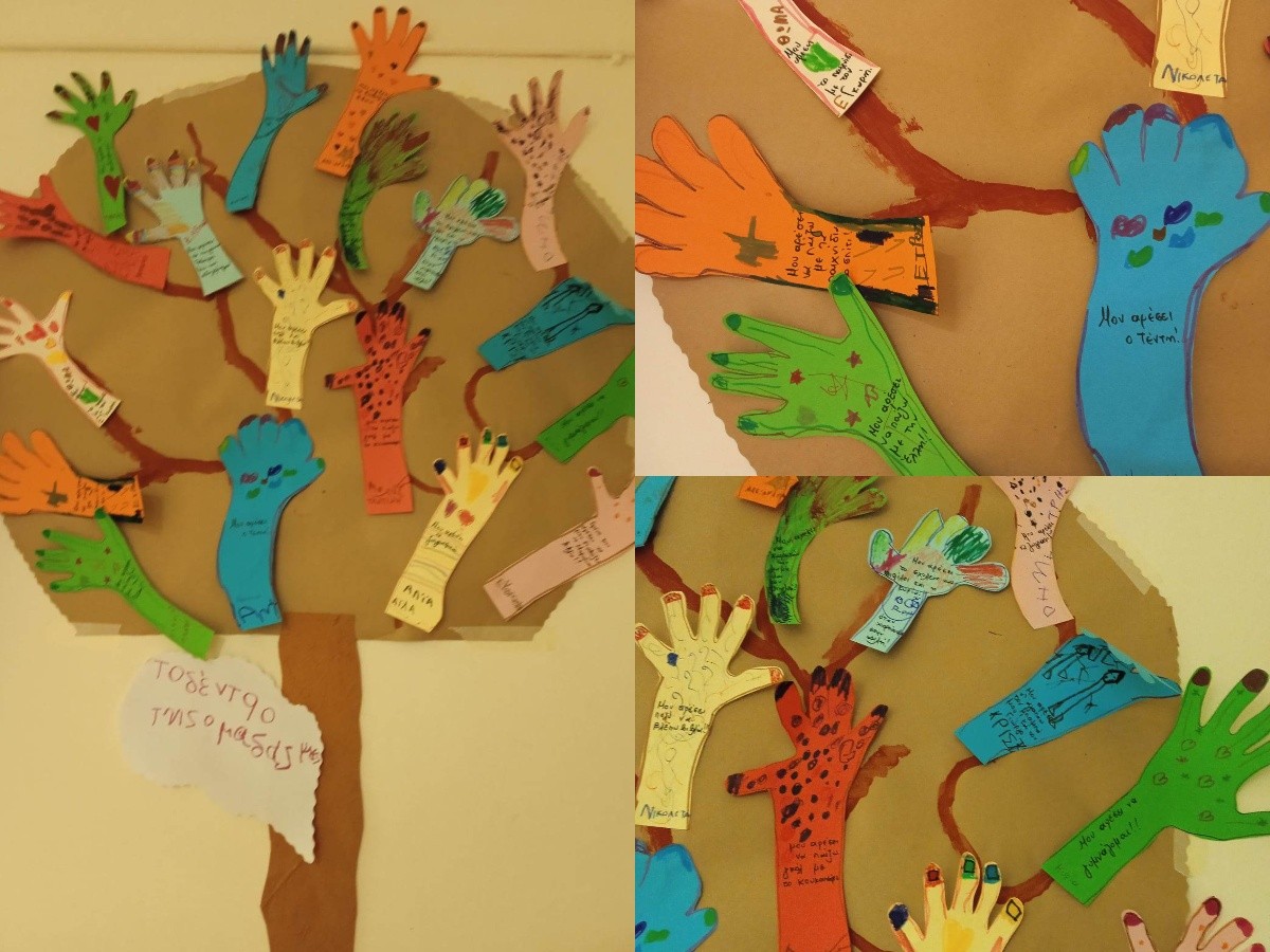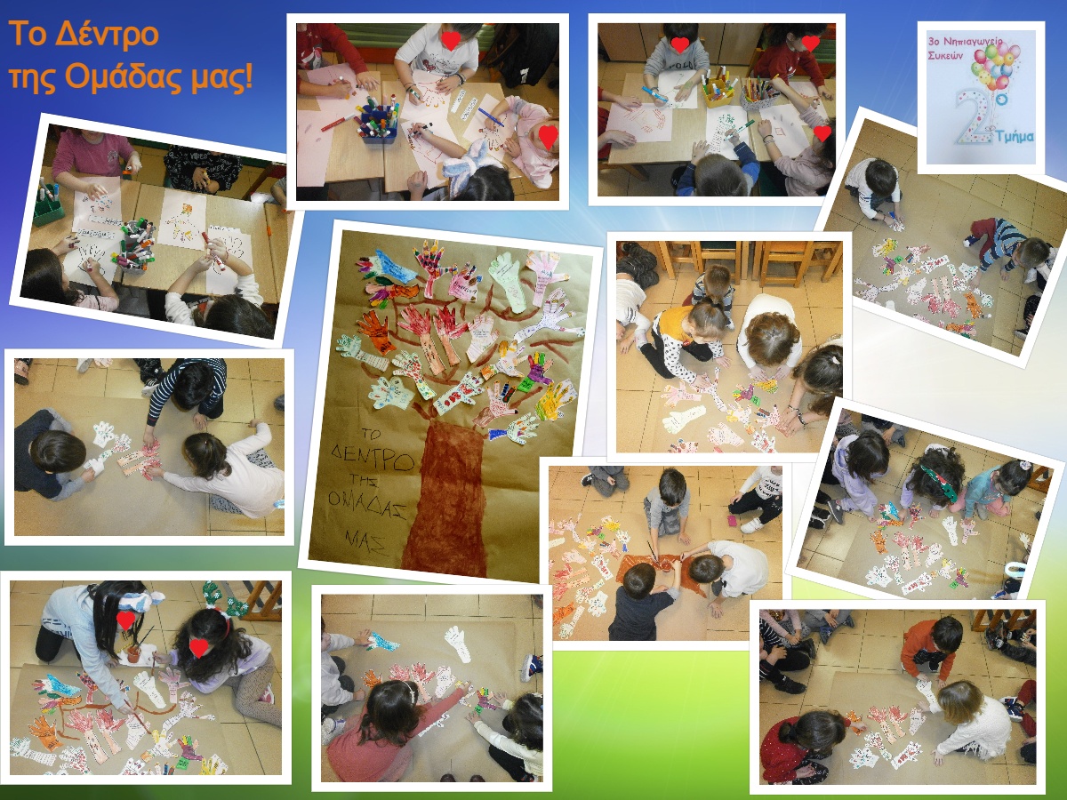 Στα πλαίσια του δεύτερου εργαστηρίου δεξιοτήτων και της θεματικής ενότητας «Ενδιαφέρομαι και Ενεργώ: Κοινωνική Συναίσθηση και Ευθύνη» με σκοπό την προώθηση του αλληλοσεβασμού και της διαφορετικότητας και τα τρία τμήματα ανέπτυξαν δραστηριότητες σύμφωνα με το σχέδιο δράσης μας με τίτλο “Αλληλοσεβασμός και Διαφορετικότητα στο Νηπιαγωγείο”. Τα παιδιά συγκρότησαν ομάδες συνεργασίας, αποφάσισαν για το συμβόλαιο της ομάδας και έφτιαξαν «Το δέντρο της ομάδας τους». Παράλληλα ενισχύθηκε το αίσθημα της ταυτότητας τους με παιχνίδια και δημιουργίες αναφορικά με «Το όνομά μου- το σπίτι μου».