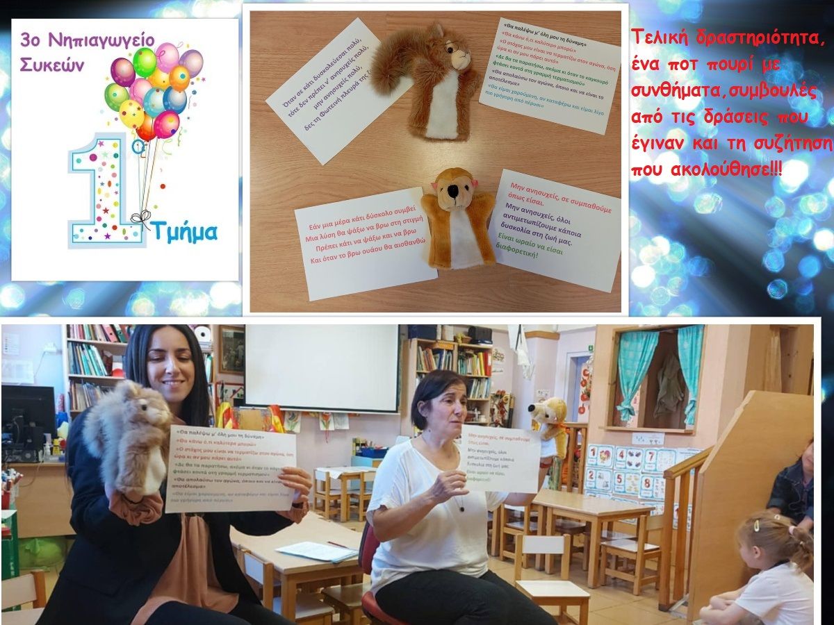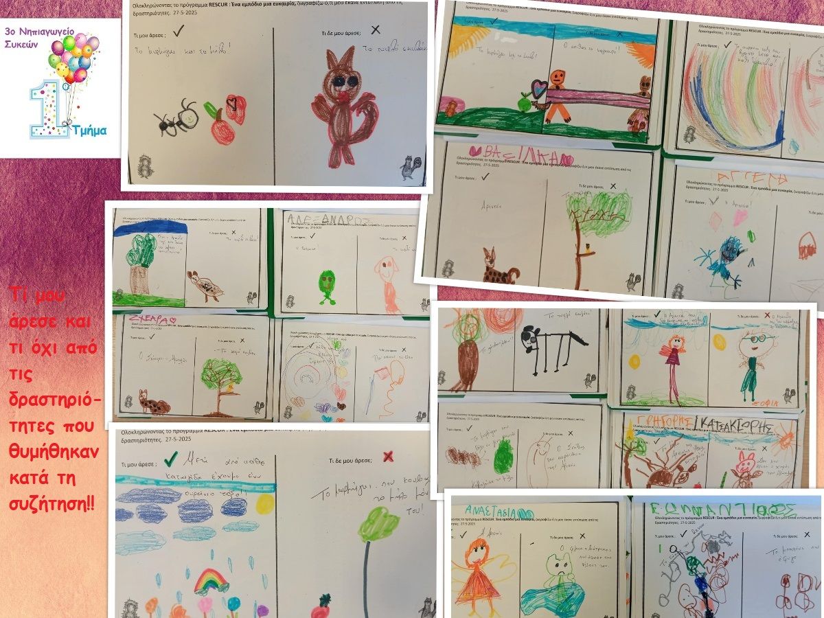 Αυτή την εβδομάδα το 1ο και το 3ο τμήμα του νηπιαγωγείου μας πραγματοποίησαν την τελευταία δραστηριότητα του Ευρωπαϊκού προγράμματος RESCUR. Ο Ηρακλής και η Αριστέα θύμισαν στα παιδιά πολλά από τα σημαντικά μηνύματα που τους έμαθαν σε όλη τη διάρκεια του προγράμματος και με μια στοχευμένη συζήτηση τα παιδιά αξιολόγησαν το πρόγραμμα. Στο τέλος ζωγράφισαν ότι τους άρεσε περισσότερο και λιγότερο από το ταξίδι αυτό της ψυχικής ανθεκτικότητας και αποχαιρέτησαν τον Ηρακλή και την Αριστέα. Γονείς και εκπαιδευτικοί συμπλήρωσαν επίσης τα ερωτηματολόγια αξιολόγησης του προγράμματος.