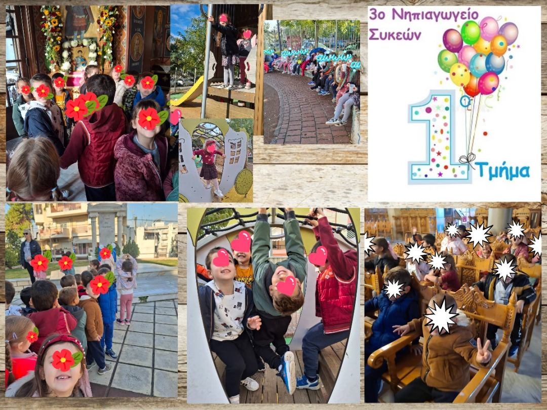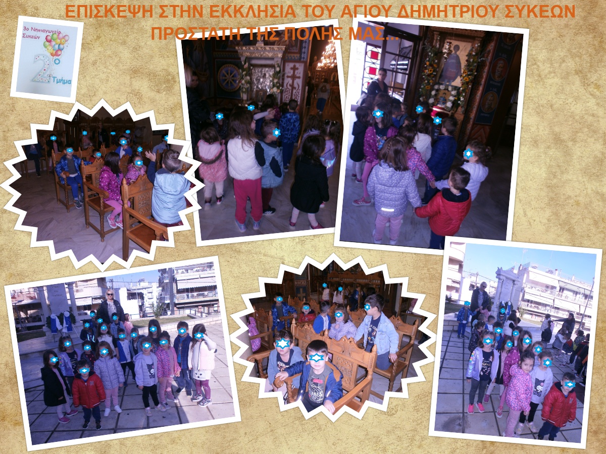 Την Πέμπτη 30 Οκτωβρίου και τα τρία τμήματα του νηπιαγωγείου μας επισκέφτηκαν τον Ι. Ναό του Αγίου Δημητρίου, πολιούχου της ενορίας και της πόλης μας. Ευχαριστούμε πολύ τον π. Χρήστο που μας μίλησε για τον βίο του Αγίου. Στο προαύλιο παρατηρήσαμε τα στεφάνια στο ηρώο ….”ΣΤΑΘΙ ΚΑΙ ΟΙΚΤΙΡΟΝ”. Μέχρι την επόμενη στάση, το πάρκο με τον μεγάλο πλάτανο, παρατηρήσαμε λουλούδια, δέντρα και φθινοπωρινούς καρπούς. Τελευταία στάση η παιδική χαρά!