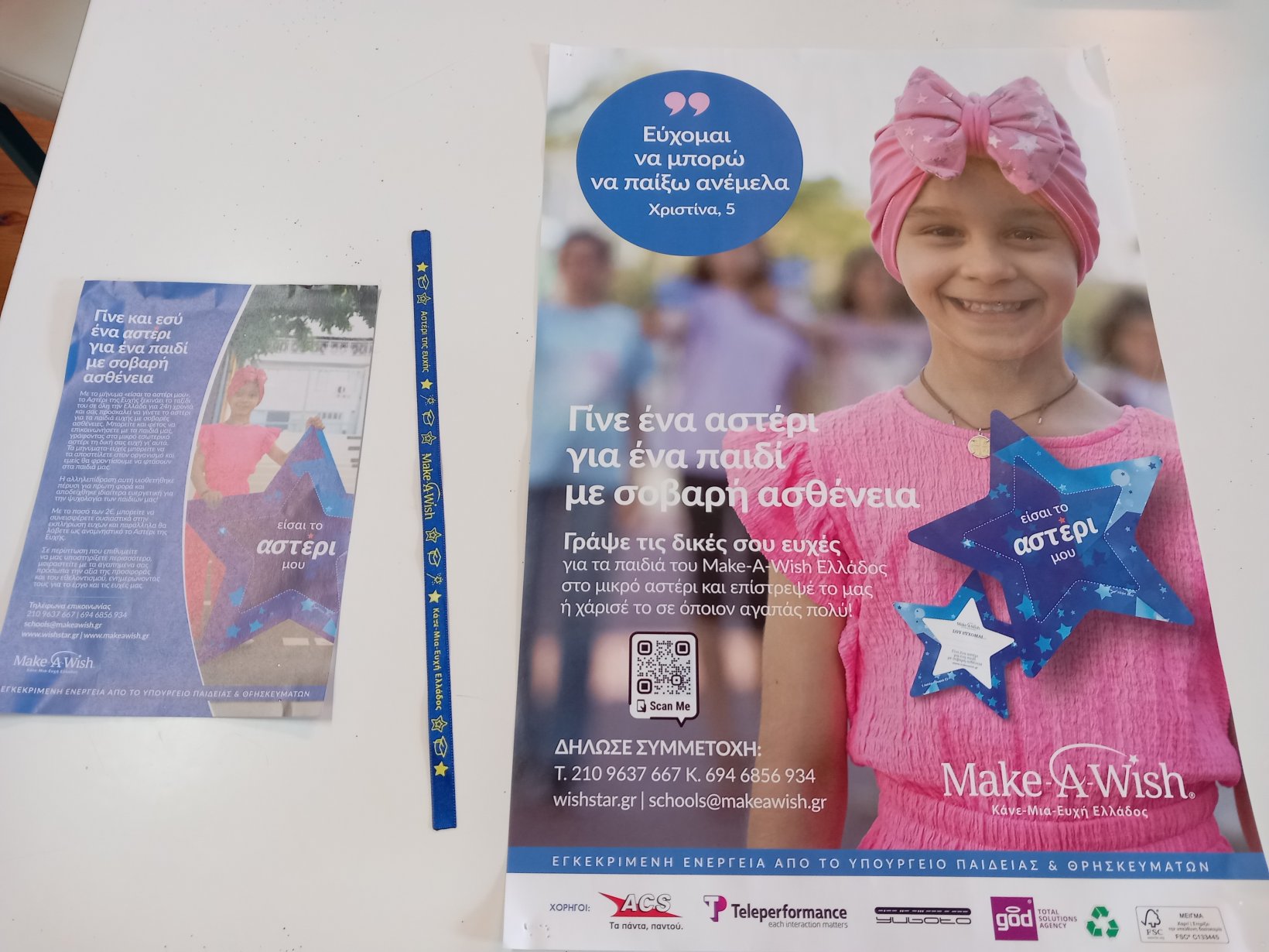 Συμμετοχή του νηπιαγωγείου κι ενίσχυση της προσπάθειας του Make-a-Wish Greece Συμμετείχαμε στην προσπάθεια του make-a-wish Greece για να πραγματοποιηθούν οι ευχές παιδιών που πάσχουν από ανίατες ασθένειες.
