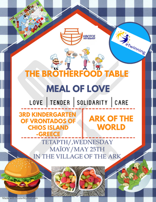 Το σχολείο μας , ολοκληρώνοντας το eTwinning πρόγραμμα “Τhe brotherFood Τable” στα πλαίσια της κοινωνικής του ευθύνης και προωθώντας την σημασία της διατροφής ως δικαίωμα και ανάγκη για τα παιδιά όλου του κόσμου ευαισθητοποιώντας τα νήπια μας σε αυτό καθ΄ όλη την διάρκεια του προγράμματος θα επισκεφτεί την Κιβωτό του Κόσμου στο Αίπος και θα προσφέρει ένα γεύμα αγάπης για τα παιδιά που βρίσκονται εκεί. Η δράση θα γίνει την Τετάρτη 25 Μαΐου στις 10:00 το πρωί