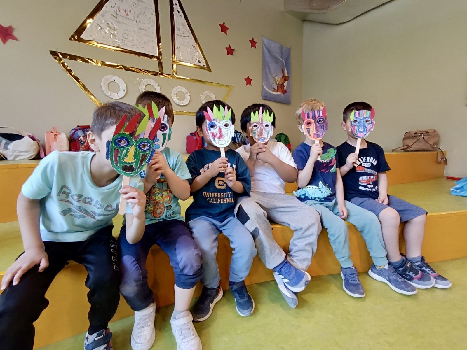 Τα παιδιά δούλεψαν σε ομάδες, χρωμάτισαν και διακοσμήσαν τις μάσκες τους.