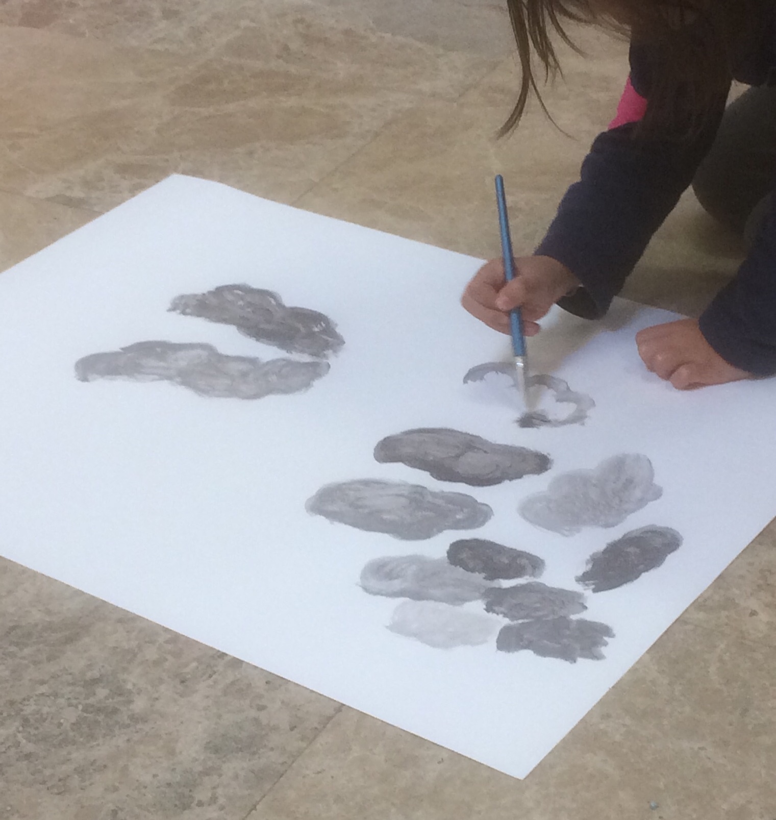 Παρατηρώντας τα σύννεφα, μάθαμε να φτιάχνουμε το γκρι χρώμα, με άσπρο και μαύρο. Τα παιδιά δοκίμασαν να φτιάξουν διαφορετικές αποχρώσεις του γκρι, προσθέτοντας περισσότερο άσπρο ή μαύρο και σχημάτισαν συννεφάκια.