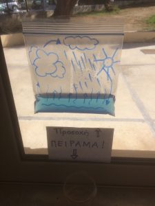 Κάναμε άλλο ένα πείραμα για τον κύκλο του νερού: Βάλαμε νερό σε ένα σακουλάκι και το στερεώσαμε με σελοτέιπ στο τζάμι, για να το βλέπει ο ήλιος. Τώρα θα κάνουμε υπομονή, να δούμε τι θα συμβεί. Εν τω μεταξύ, διατυπώσαμε τις υποθέσεις μας: