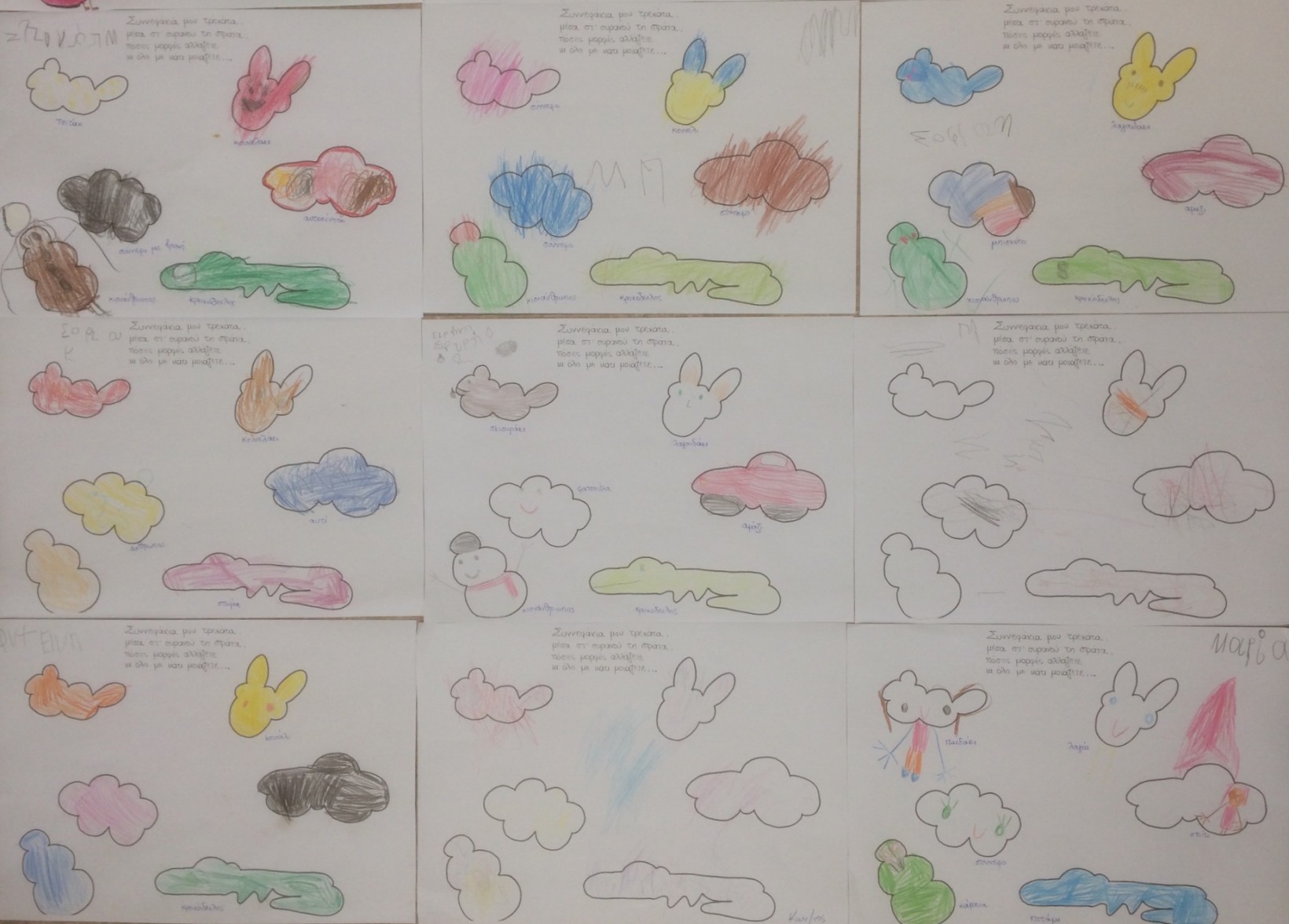 Τέλος, τα παιδιά προσπάθησαν να σκεφτούν τι τους θυμίζουν τα σχήματα από διάφορα σύννεφα και να τα ζωντανέψουν.