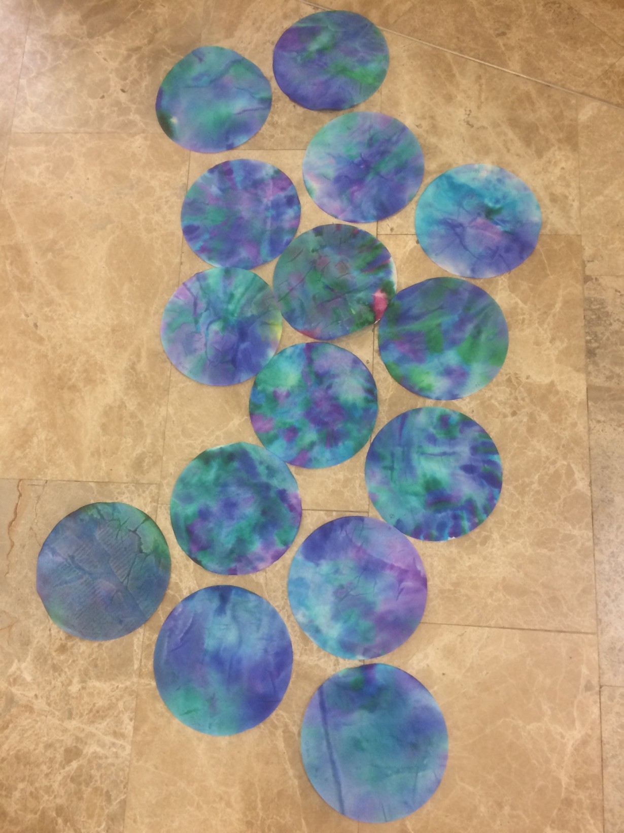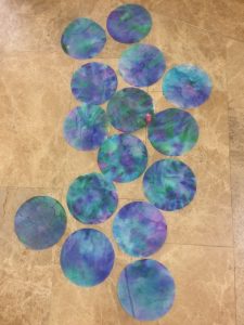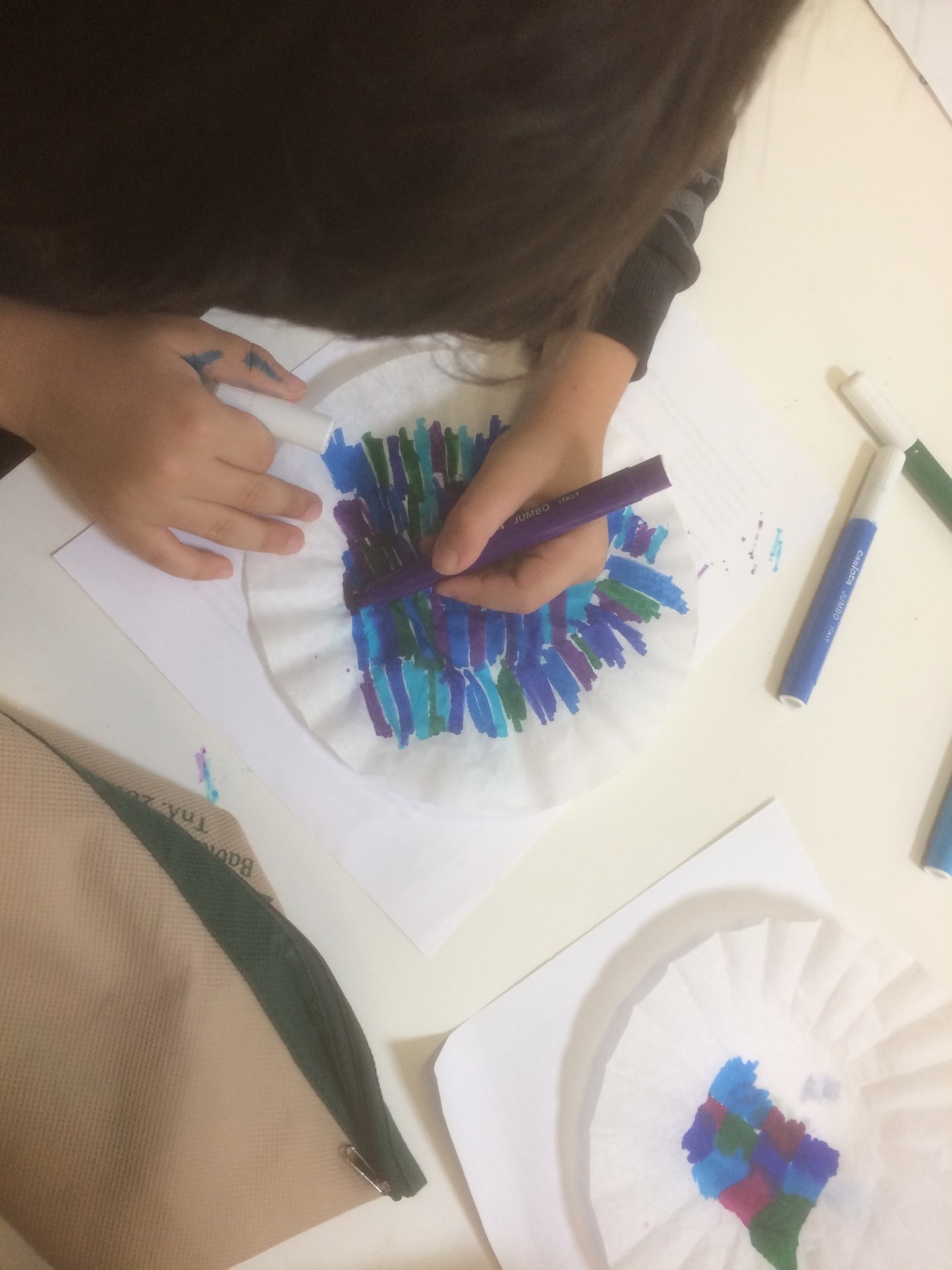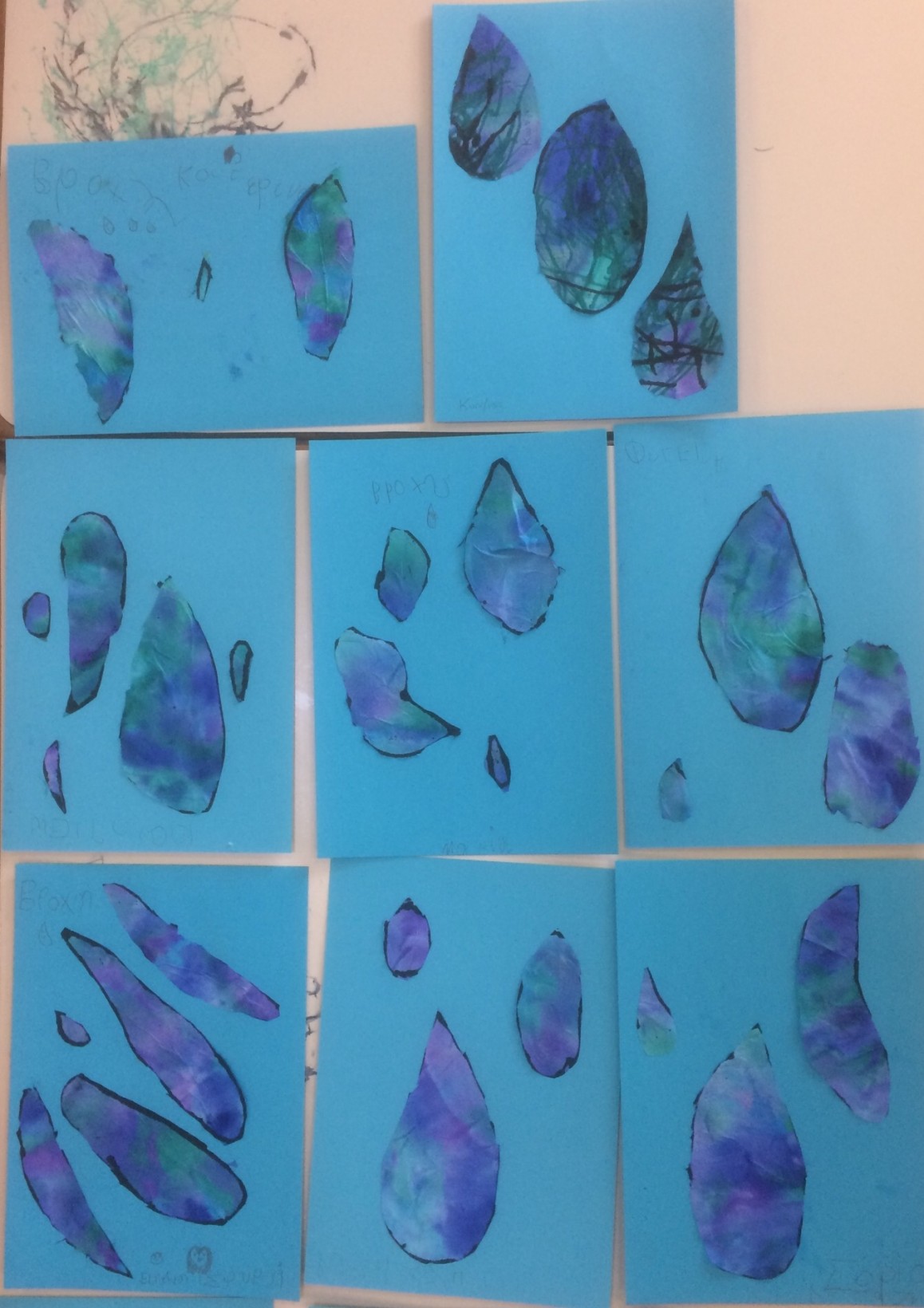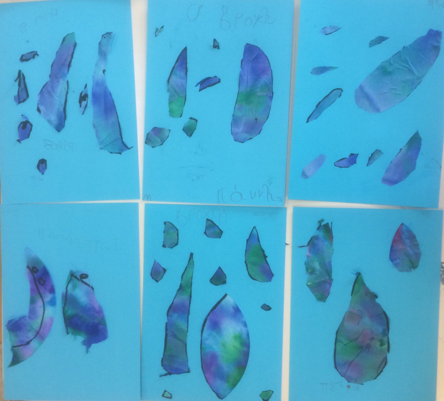 Κάθε παιδί διάλεξε από τους μαρκαδόρους του αυτούς με τα ψυχρά χρώματα και χρωμάτισε με αυτά ένα μεγάλο φίλτρο καφέ. Στη συνέχεια, ψέκασε με νερό και είδε τα χρώματα να μπερδεύονται μεταξύ τους. Όταν το νερό στέγνωσε, ζωγραφίσαμε και κόψαμε σταγόνες νερού!