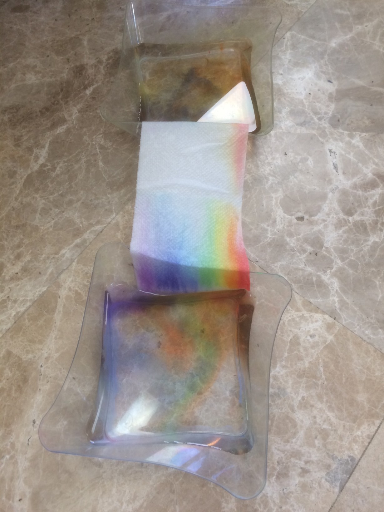 Πείραμα-έκπληξη με τα χρώματα του ουράνιου τόξου: Αφού μιλήσαμε για το ουράνιο τόξο και μάθαμε για τα χρώματά του και τη σειρά τους, τα ζωγραφίσαμε στις δυο άκρες ενός διπλωμένου χαρτιού κουζίνας. Βυθίσαμε τις άκρες σε λίγο νερό και είδαμε τα χρώματα να ανεβαίνουν πάνω στο χαρτί, να ενώνονται στη μέση και να σχηματίζουν ουράνιο τόξο!