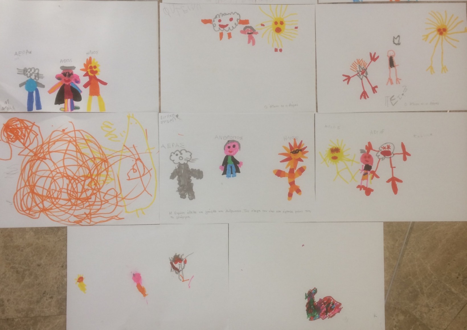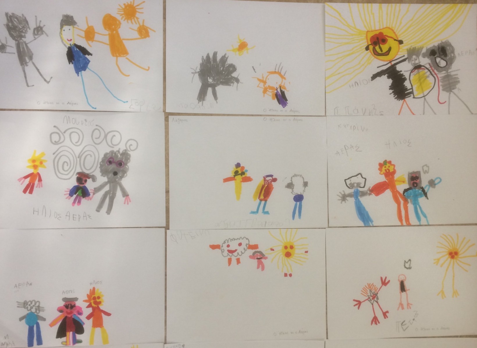 Τέλος, φανταστήκαμε τον ήλιο και τον αέρα από το ποίημα του Γ. Δροσίνη «Ο Ήλιος κι ο Αέρας» σαν ανθρώπους και τους ζωγραφίσαμε.