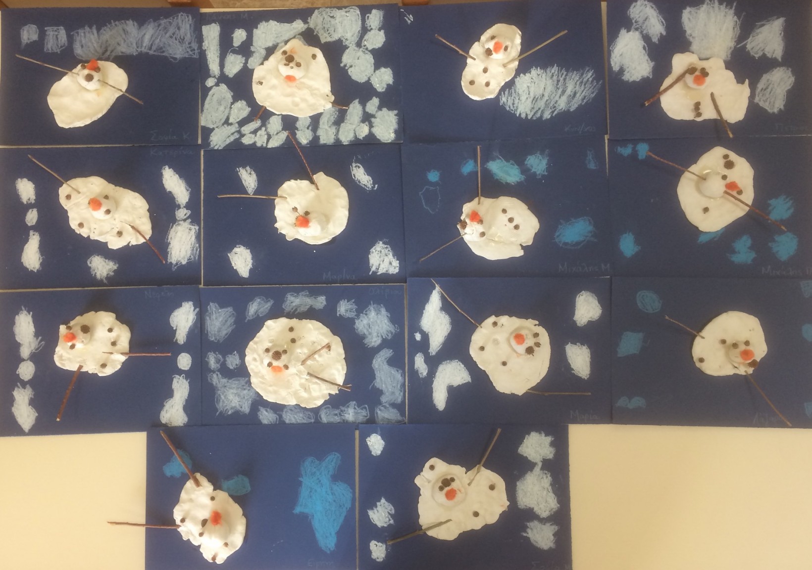 Φτιάξαμε και ένα καδράκι για το Γενάρη και γράψαμε την παροιμία: «Του Γενάρη το φεγγάρι μοιάζει με μαργαριτάρι». Το φεγγάρι έγινε με πηλό, το κάτασπρο χιονισμένο δεντράκι του με χαρτάκια που σκίσαμε με τα χεράκια μας.
