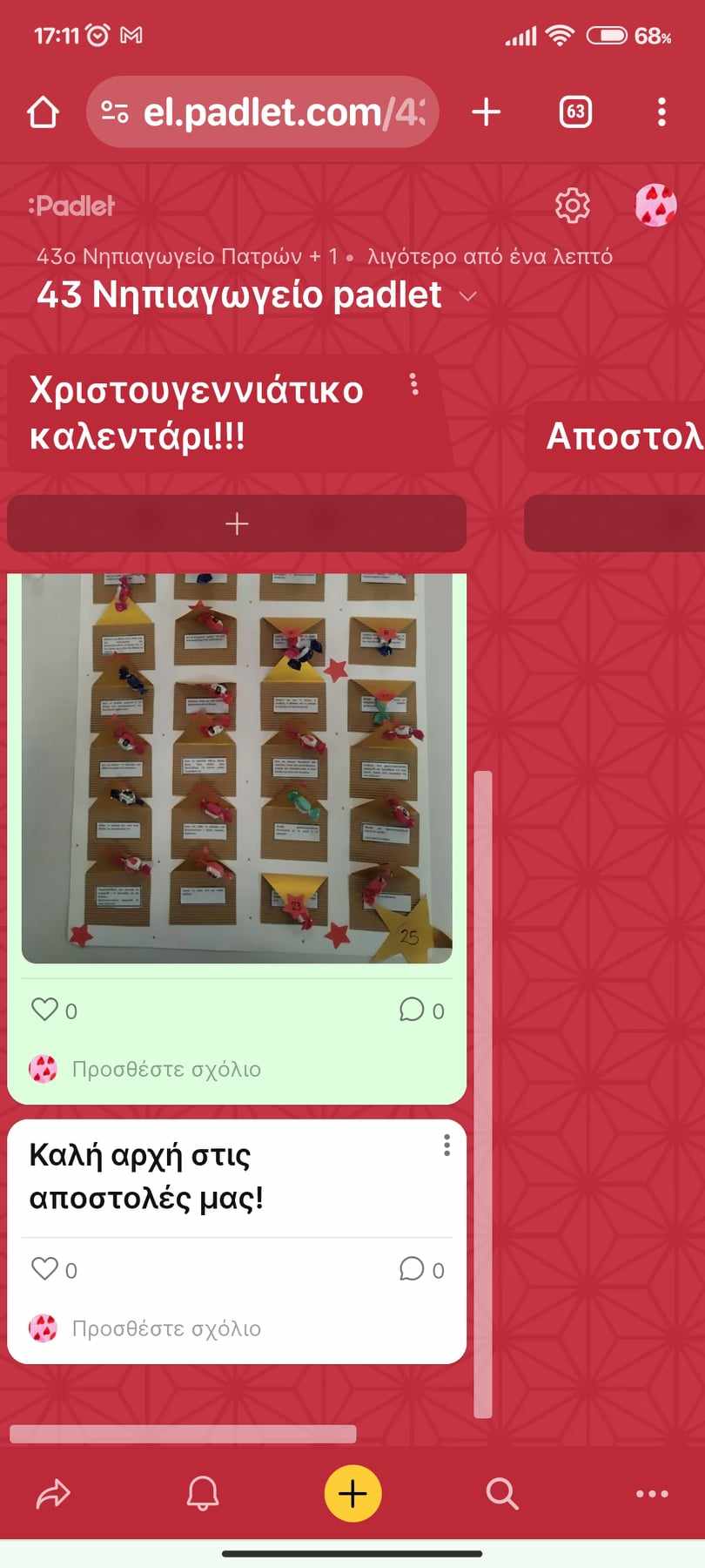 Στην αρχή της Χριστουγεννιάτικη περιόδου, δημιουργήσαμε ένα ημερολόγιο κατασκευή αντίστροφης μέτρησης μέχρι τα Χριστούγεννα κάτω από κάθε μέρα υπήρχε μια εορταστική αποστολή αποστολή για τους μαθητές και τους γονείς τους. Κάθε αποστολή που πραγματοποιούνταν ανέβαινε στο padlet του σχολείου.