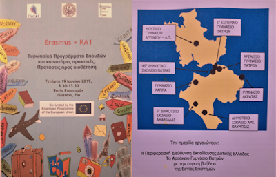 Σήμερα, 19 Ιουνίου 2019, η Περιφερειακή Εκπαίδευση Δυτικής Ελλάδος και το Αρσάκειο Γυμνάσιο Πατρών οργάνωσαν ημερίδα διάχυσης αποτελεσμάτων Ευρωπαϊκών Προγραμμάτων Erasmus+ KA1. H ημερίδα υλοποιήθηκε στην Εστία Επιστημών με απόλυτη επιτυχία. Σχολεία από την Περιφέρεια Δυτικής Ελλάδας που υλοποιούν προγράμματα erasmus+ KA1 παρουσίασαν εμπειρίες, ιδέες, πρακτικές και κουλτούρες από ευρωπαϊκά Σχολεία. Έγινε γόνιμος διάλογος για την αξιοποίηση αυτής της διάχυσης στις σχολικές κοινότητες και στην κοινωνία ευρύτερα. Συγχαρητήρια στην Περιφερειακή Διεύθυνση Δυτικής Ελλάδας αλλά και στο Αρσάκειο Γυμνάσιο Πατρών για την άρτια οργάνωση και την ζεστή φιλοξενία. Το 46ο Δημοτικό Σχολείο Πατρών παρουσίασε το erasmus+ KA1 πρόγραμμα που υλοποιεί. Μέσα από παρουσιάσεις και βίντεο έγινε διάχυση των αποτελεσμάτων από τις κινητικότητες που έχουν γίνει στην Βαρκελώνη της Ισπανίας και στο Moss της Νορβηγίας.