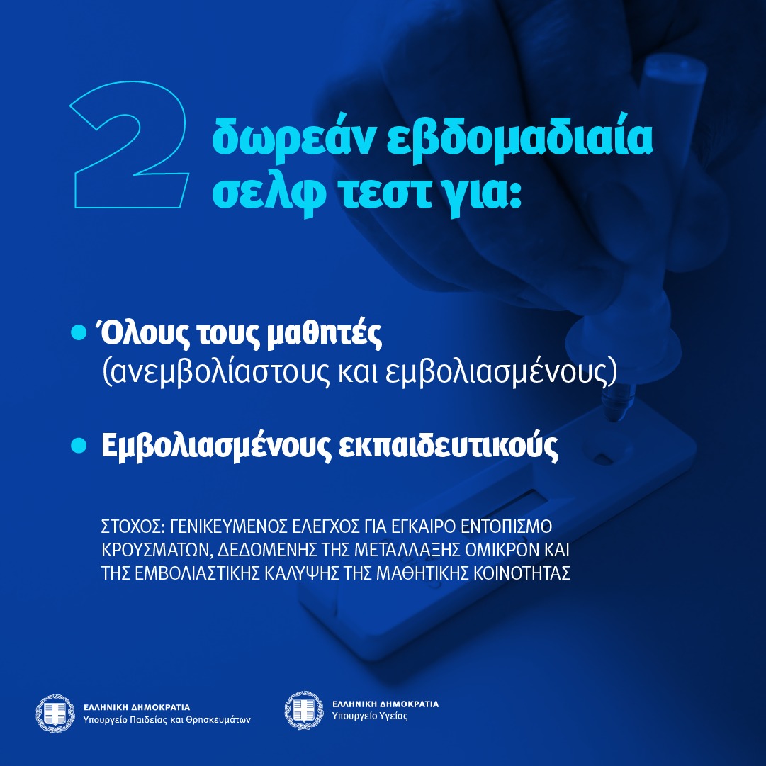 - Αν πρόκειται για εμβολιασμένους μαθητές, τότε προσέρχονται στο σχολείο κανονικά και κάνουν τρία σελφ τεστ τις ημέρες 0-1, 3 και 5-7.