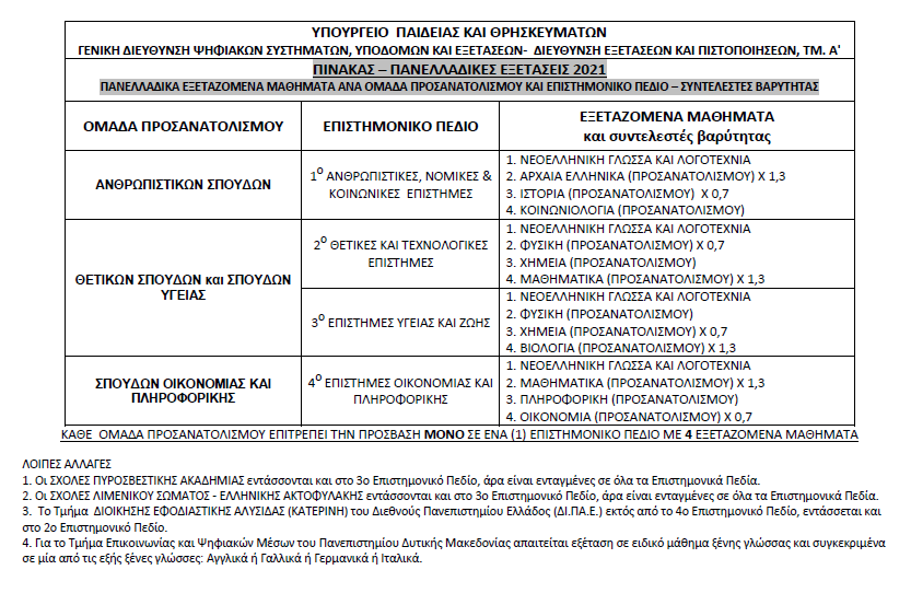 ΠΑΝΕΛΛΑΔΙΚΑ ΕΞΕΤΑΖΟΜΕΝΑ ΜΑΘΗΜΑΤΑ ΑΝΑ ΟΜΑΔΑ ΠΡΟΣΑΝΑΤΟΛΙΣΜΟΥ ΚΑΙ ΕΠΙΣΤΗΜΟΝΙΚΟ ΠΕΔΙΟ – ΣΥΝΤΕΛΕΣΤΕΣ ΒΑΡΥΤΗΤΑΣ