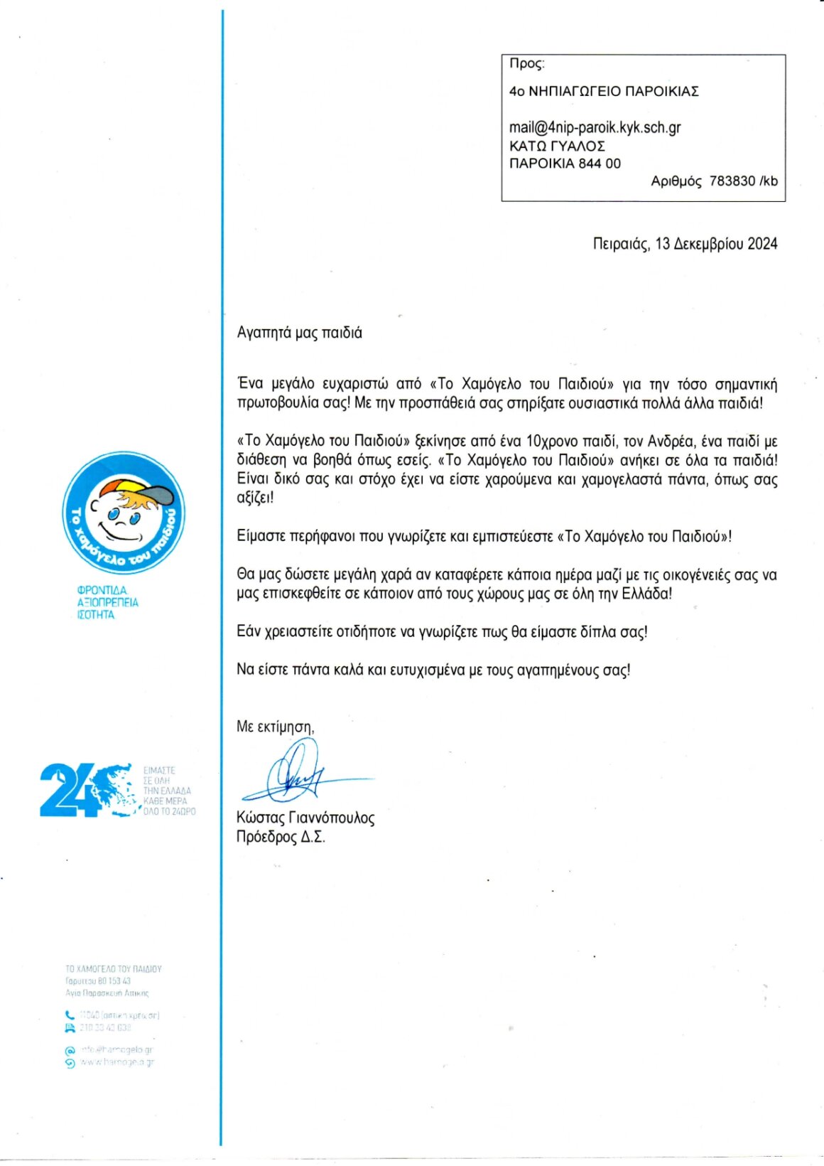 Οι μικροί μαθητές και οι μικρές μαθήτριες μαζί με τις εκπαιδευτικούς, αποφάσισαν να βοηθήσουν και να συνδράμουν στο έργο που υλοποιεί το Χαμόγελο του Παιδιού. Γι’ αυτό το λόγο, συγκέντρωσαν και έστειλαν διάφορα προϊόντα, αγαθά και τρόφιμα στον οργανισμό!