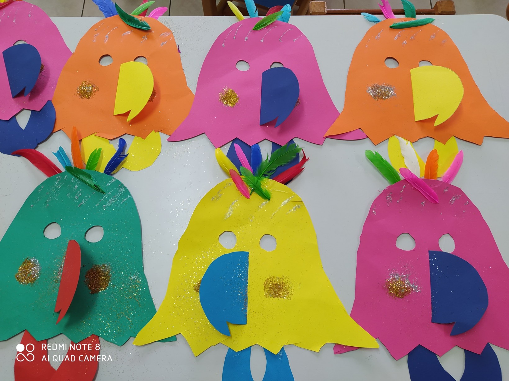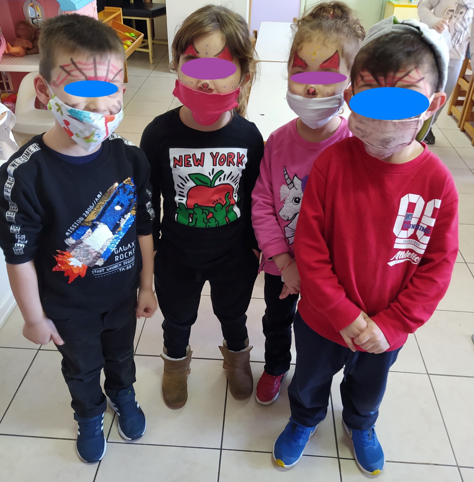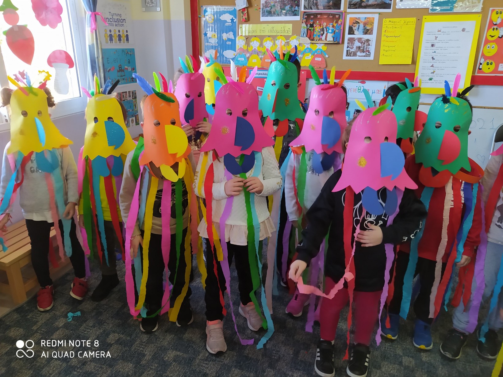 Το νηπιαγωγείο μας μετατρέπεται σε ‘’εργαστήρι’’: μάσκες, στολές, ζωγραφική, ιστορίες, κατασκευές, face painting, αλλά και παιχνίδια, τραγούδια, χορός, γαϊτανάκια ‘’γάμοι’’, μουσικές.