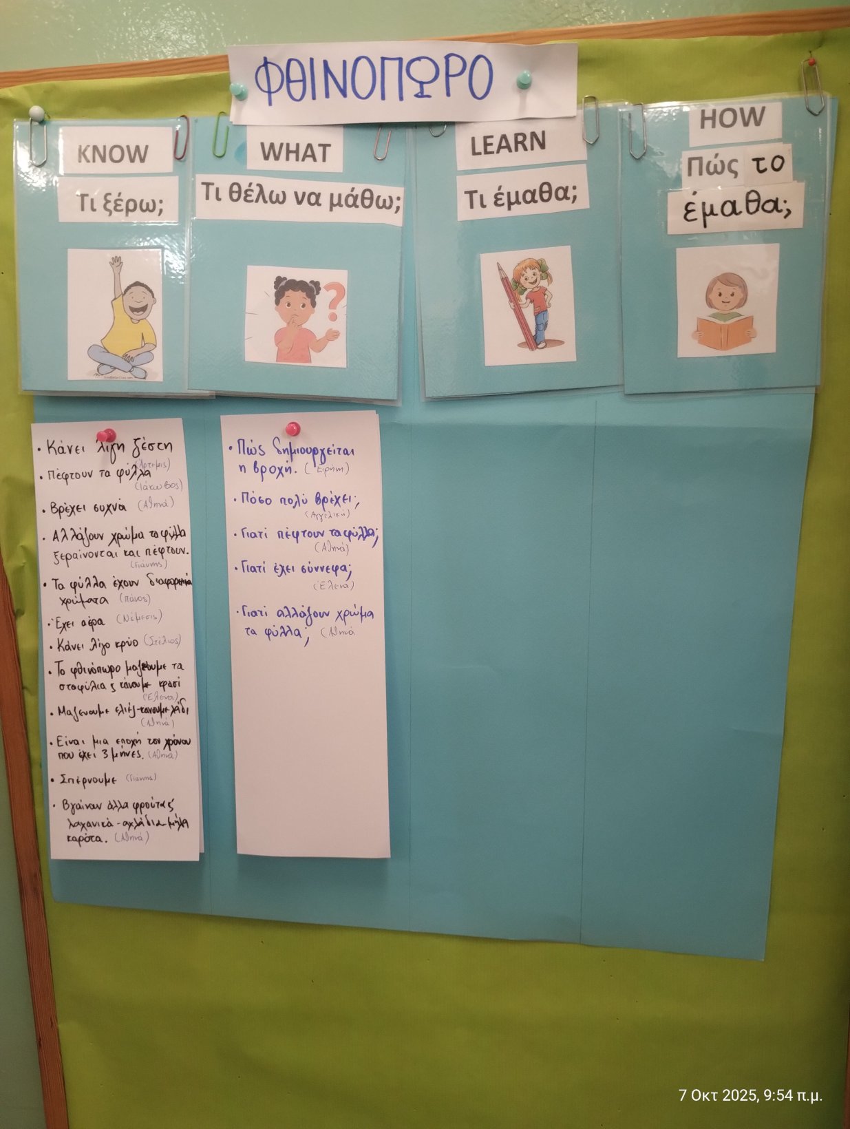 Εδώ είναι και ο πίνακας “Τι Ξέρω, Τι Θέλω να Μάθω, Τι Έμαθα, Πώς το Έμαθα” (γνωστός και ως K-W-L-H) που είναι ο “Χάρτης της Γνώσης” των μαθητών. Λειτουργεί ως ένας καθρέφτης που επιτρέπει στα παιδιά να βλέπουν την πορεία της μάθησής τους από την αρχή έως το τέλος της διερεύνησης.