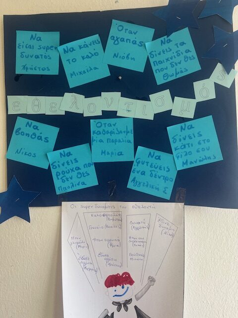 - Σε φύλλο εργασίας φτιάχνουν το βαλιτσάκι πρώτων βοηθειών του εθελοντή/ντριας και ζωγραφίζουν τις υπερδυνάμεις “γιατρικά” που χρησιμοποιεί ο εθελοντή/ντρια για να θεραπεύει όποιους ανθρώπους το έχουν ανάγκη.