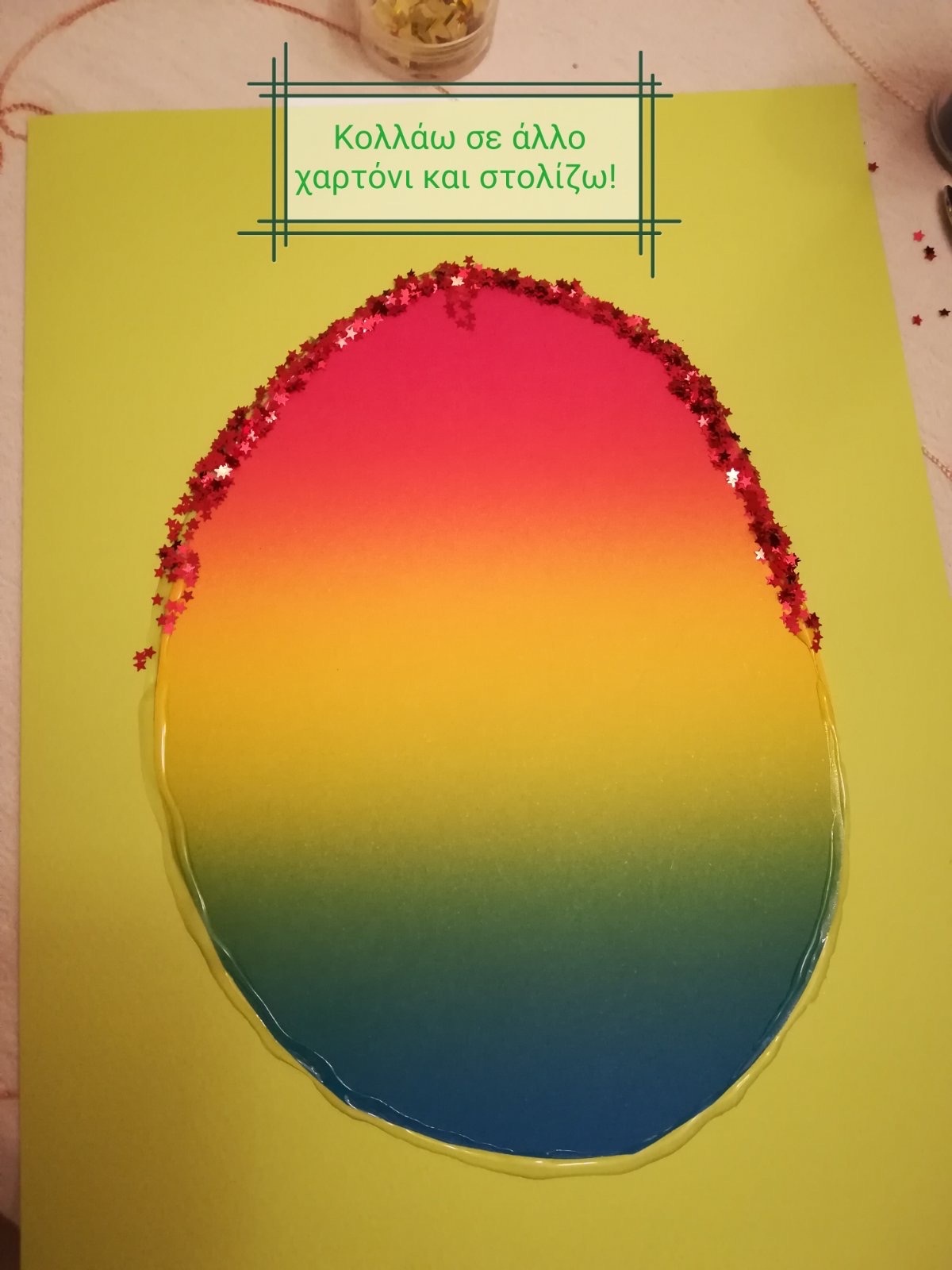 - Κολλάω τα μέρη που έκοψα, δηλαδή τα ποδαράκια, το λοφίο, τη μύτη και την κοιλίτσα από το κοτοπουλάκι μου στην κάρτα