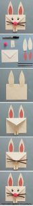 Σ΄ ένα χαρτί Α4 γράφουμε τις ευχές μας και το διπλώνουμε όπως στην παρακάτω εικόνα .Προσθέτουμε τα αυτάκια και τα ζωγραφίζουμε, μυτούλα,μάτια και έτοιμη η κάρτα λαγός!