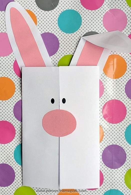Σ΄ ένα χαρτί Α4 γράφουμε τις ευχές μας και το διπλώνουμε όπως στην παρακάτω εικόνα .Προσθέτουμε τα αυτάκια και τα ζωγραφίζουμε, μυτούλα,μάτια και έτοιμη η κάρτα λαγός!