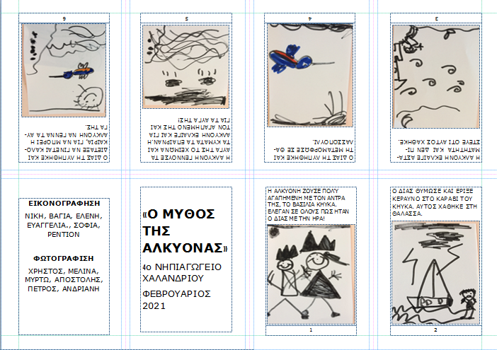 Μας άρεσε πολύ και ο μύθος “της πανέμορφης γυναίκας, η οποία παντρεύτηκε το βασιλιά Κήυκα. Ο γάμος τους ήταν πολύ ευτυχισμένος. Και οι δυο τους πίστεψαν ότι ήταν ισάξιοι των Θεών. Ο Δίας όμως θύμωσε..Τιμώρησε την αλαζονεία τους βυθίζοντας το καράβι του Κήυκα. Η Αλκυόνη θρήνησε το χαμό του άντρα της. Ο Δίας τη λυπήθηκε και τη μεταμόρφωσε σ’ ένα πανέμορφο πουλί, το οποίο όμως ήταν καταδικασμένο να γεννά τα αυγά του τον χειμώνα. Έτσι, τα αγριεμένα κύματα κατέστρεφαν τη φωλιά με τα αυγά της Αλκυόνης.