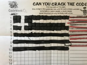 Τα παιδιά μας πήραν μέρος με μια εξαιρετική δραστηριότητα που ονομάζεται “Crack the Code – Σπάσε τον Κώδικα”. Έπρεπε να ζωγραφίσουν με μαύρο μαρκαδόρο μια εικόνα σε ένα πλέγμα και στη συνέχεια να την κωδικοποιήσουν, χρησιμοποιώντας κάτι σαν δυαδικό σύστημα, έναν κώδικα δλδ. Για κάθε μαύρο τετράγωνο χρησιμοποίησαν τον αριθμό 1 και για κάθε λευκό, το 0. Έτσι, έγραψαν τον κώδικα κάθε σειράς.