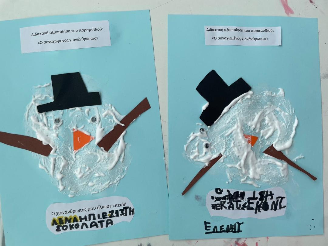 Με αφορμή το εξαιρετικό παραμύθι της Μ.Wright “Ο συναχωμένος χιονάνθρωπος” έκαναν εργασίες υπέροχες..Έφτιαξαν χιόνι, ανακατεύοντας αφρό ξυρίσματος και ατλακόλα, και δημιούργησαν τα δικά τους μικρά χιονανθρωπάκια που έλιωναν σιγά σιγά..