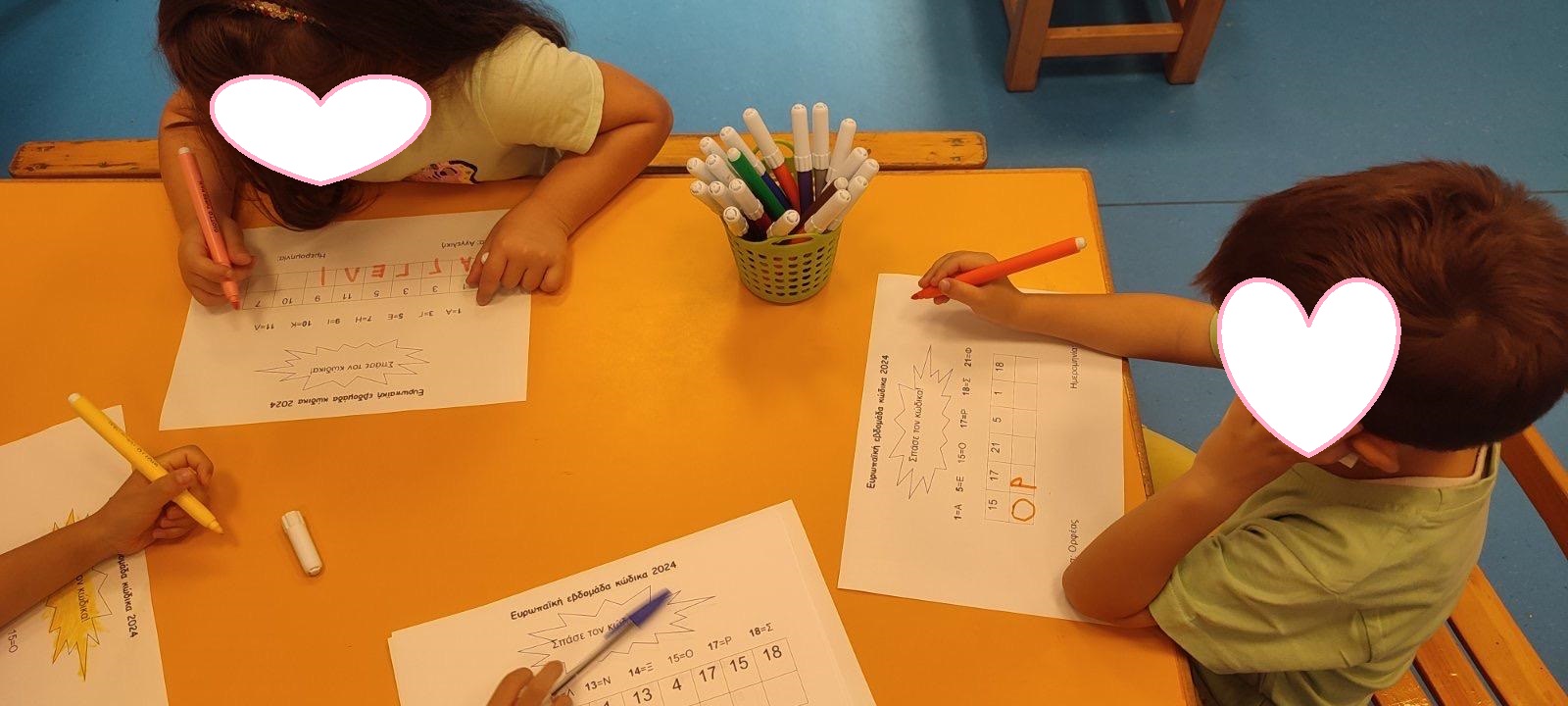 Εξηγήσαμε στα παιδιά μας τη χρήση συμβόλων και την έννοια της κωδικοποίησης και αποκωδικοποίησης. Προσπαθήσαμε να αποκωδικοποιήσουμε το μήνυμα και γράψαμε το όνομά μας.