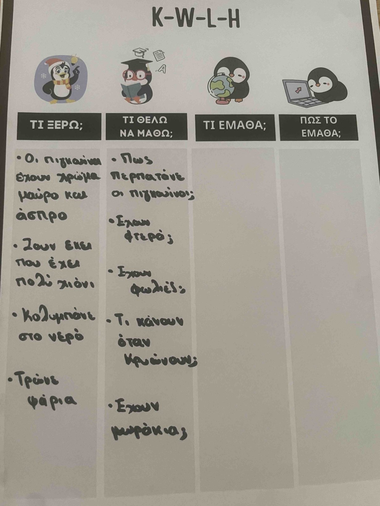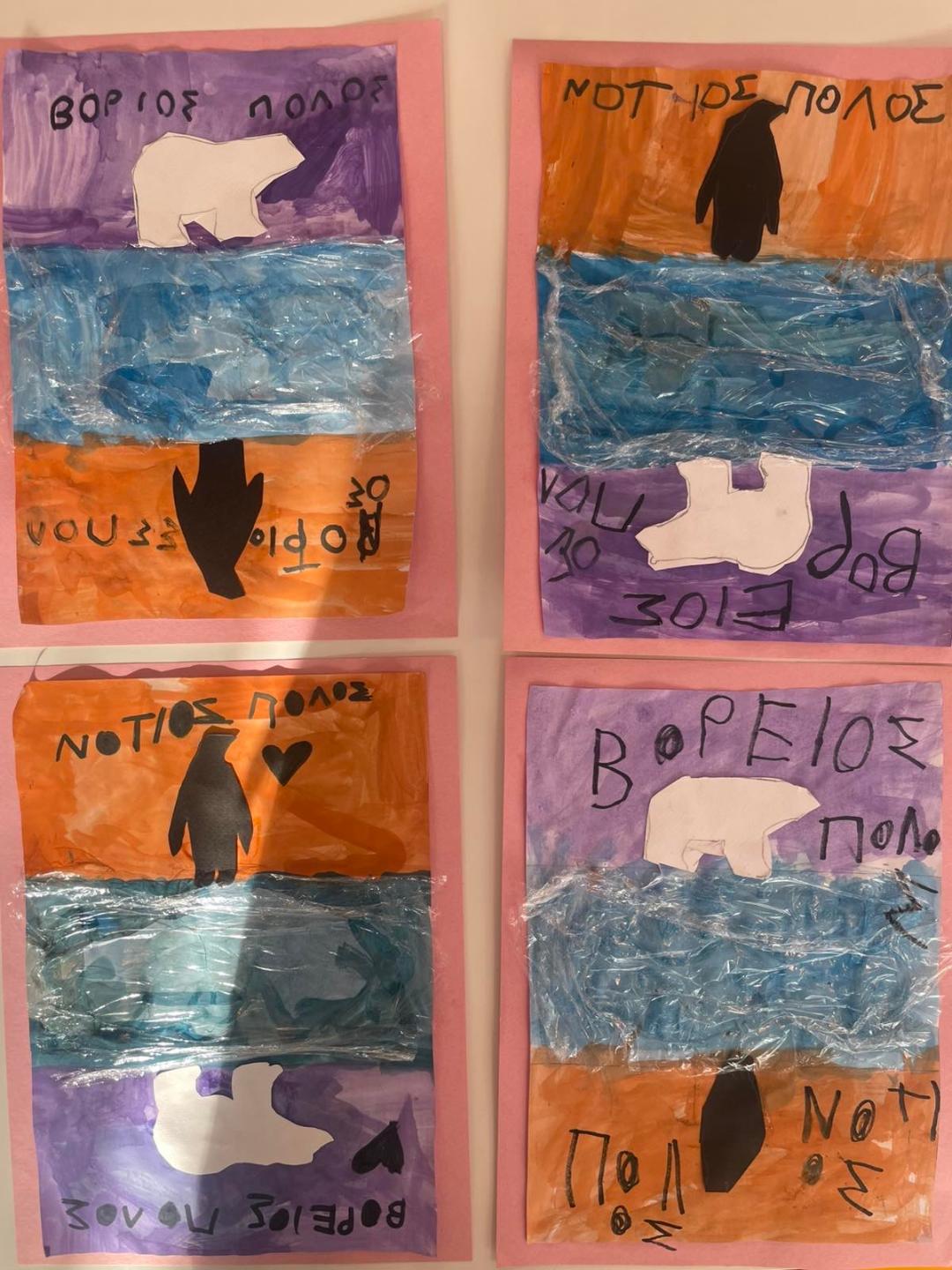 Έντονο το ενδιαφέρον μας και για για τη ζωή στους πόλους.. Ζώα της Αρκτικής, της Ανταρκτικής, το Βόρειο σέλας, η ζωή των Ινουίτ ήταν θέματα που ασχολήθήκαμε όλο αυτό το διάστημα. Τα παιδιά έχουν μάθει πλέον να προσεγγίζουν τα θέματα που μας ενδιαφέρουν σύμφωνα με το διάγραμμα KWLH