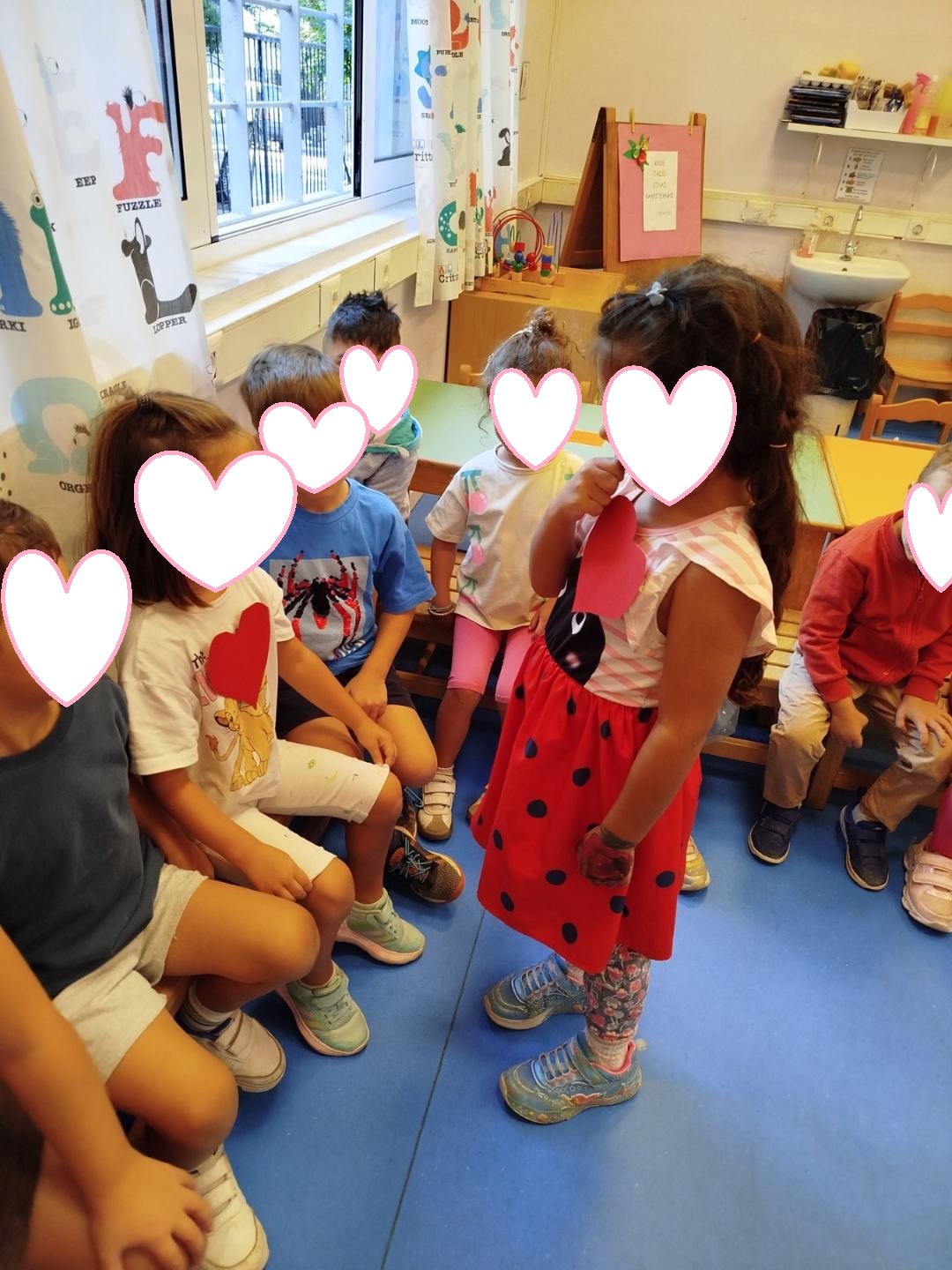 Κάθε μέρα αφιερώνουμε χρόνο για να γνωριστούν τα παιδιά, να γίνουν ομάδα. Παίζουμε απλά παιχνίδια όπως “Πώς σε λένε, πώς ;”, “Πιάσε το μπαλόνι, όταν ακούσεις το όνομά σου“, ” Χτυπώ το όνομά μου στο τύμπανο“, “Σου χαρίζω μια καρδιά και σου λέω το όνομά μου“
