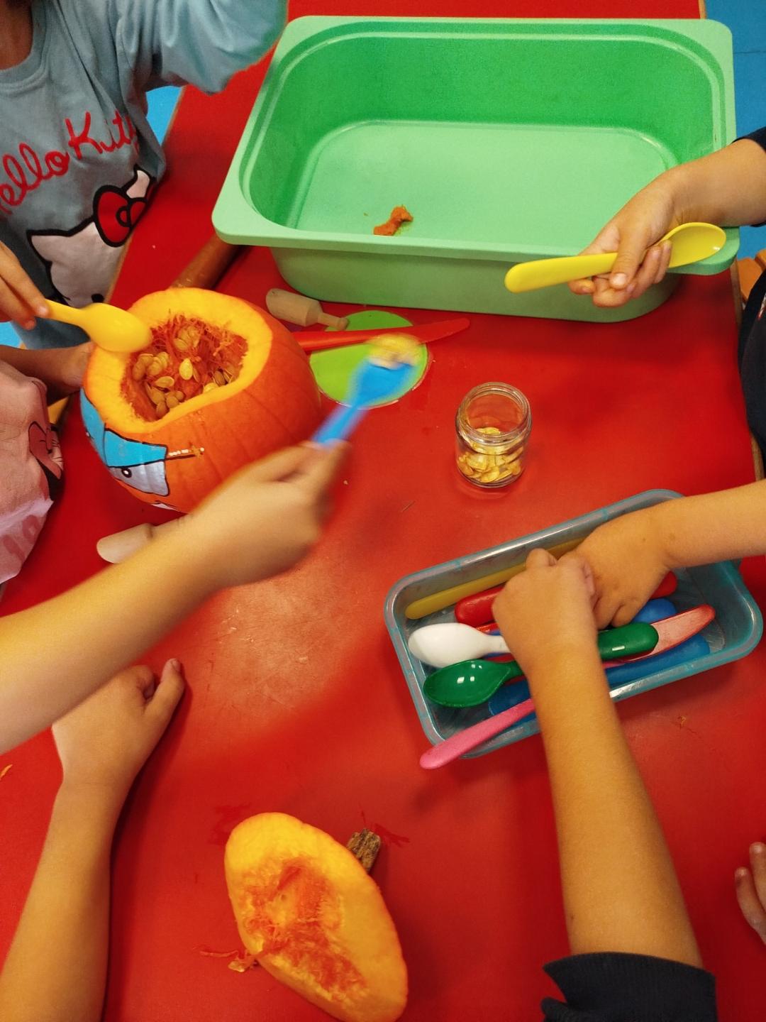 Αποφύγαμε στοιχεία που θα προκαλούσαν φόβο στα παιδιά και εστιάσαμε σε καλλιτεχνικές δραστηριότητες. Φέραμε τις κολοκύθες στην τάξη και τις παρατηρήσαμε..