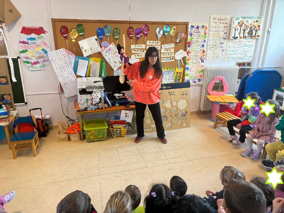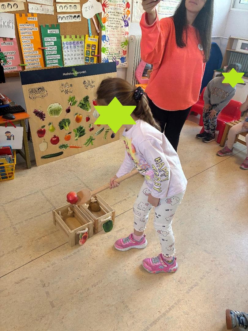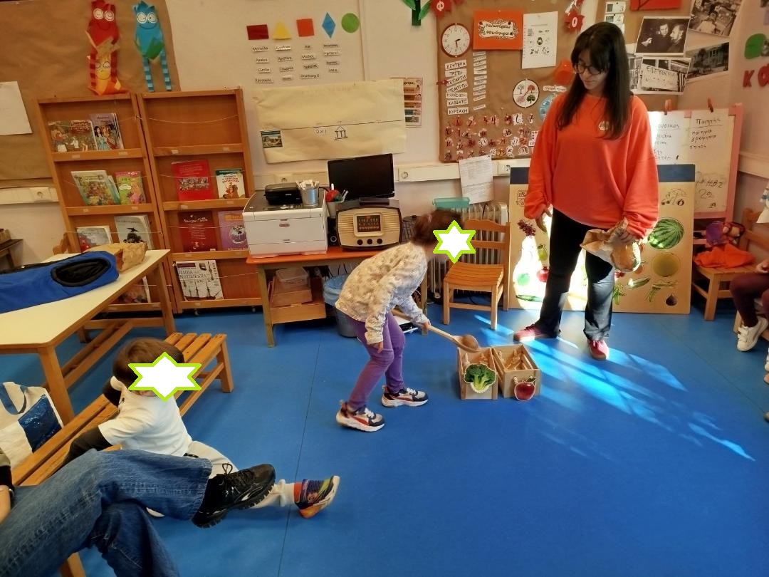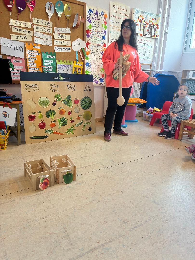 Τα παιδιά, μέσα από συζήτηση και παιγνώδεις δραστηριότητες, μίλησαν για τις βασικές ομάδες τροφών. Έπαιξαν με τη μάγισσα Μπερδεψούρα και την κουτάλα της που είχε ανακατέψει τα φρούτα και τα λαχανικά!