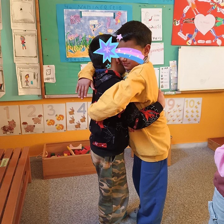 Τα παιδιά, γεμάτα ενθουσιασμό, έκαναν αγκαλιές στον εαυτό τους, στον καλύτερό τους φίλο και στο τέλος έγιναν όλοι μαζί μια μεγάλη αγκαλιά. Μέσα από αυτή τη ζεστή κίνηση, κατάλαβαν ότι η αγάπη ξεκινάει από τον εαυτό μας και απλώνεται σε όλους γύρω μας.