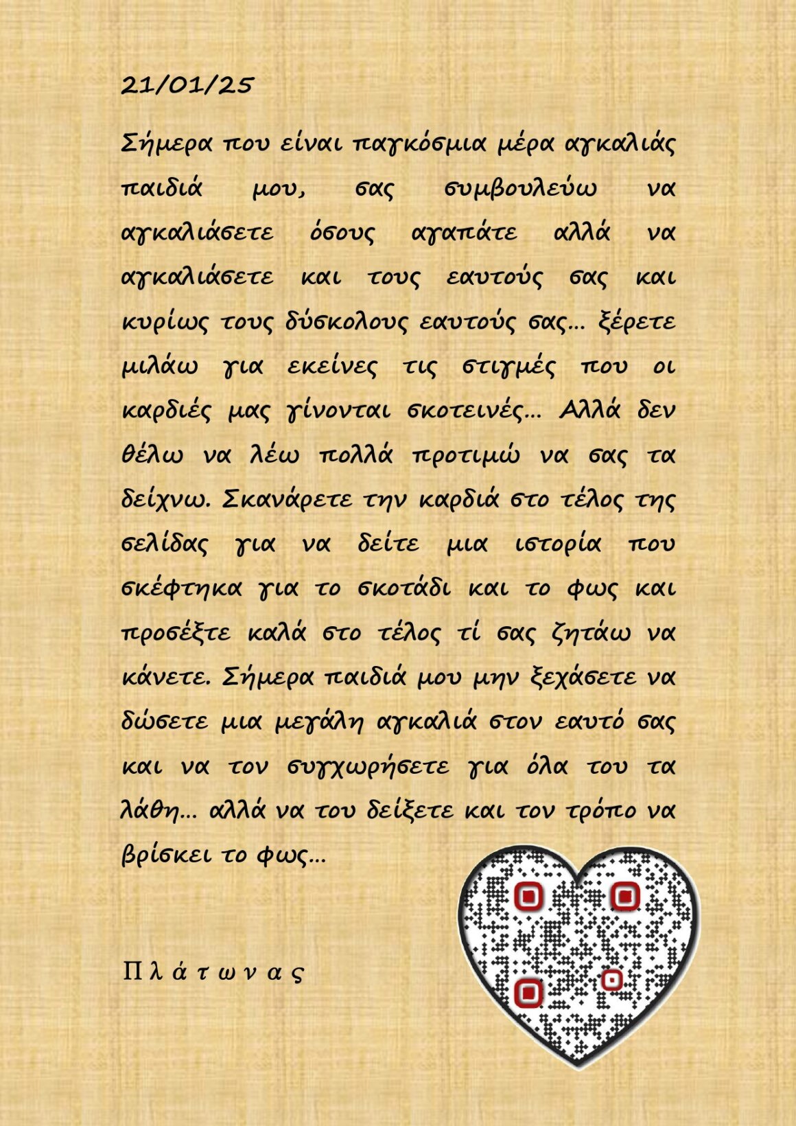 Με αφορμή το Γράμμα του παππού Πλάτωνα από το Εργαστήρι Δεξιοτήτων: “Φωτεινές Περιστροφές”, στο νηπιαγωγείο μας γιορτάσαμε την Ημέρα Αγκαλιάς με πολλή χαρά και τρυφερότητα! Ξεκινήσαμε τη μέρα μας μιλώντας για τησημασία της αγκαλιάς και πόσο σημαντική είναι για να δείχνουμε την αγάπη και τη φροντίδα μας στους ανθρώπους γύρω μας. Συζητήσαμε πώς μια αγκαλιά μπορεί να μας κάνει να νιώθουμε ασφάλεια, χαρά και ζεστασιά.