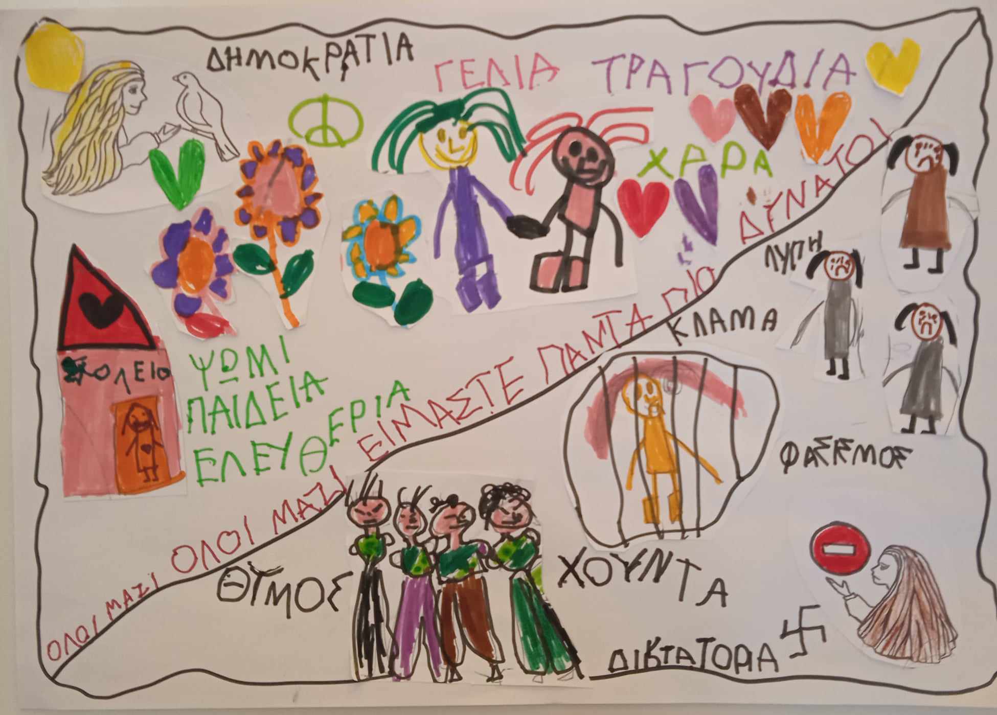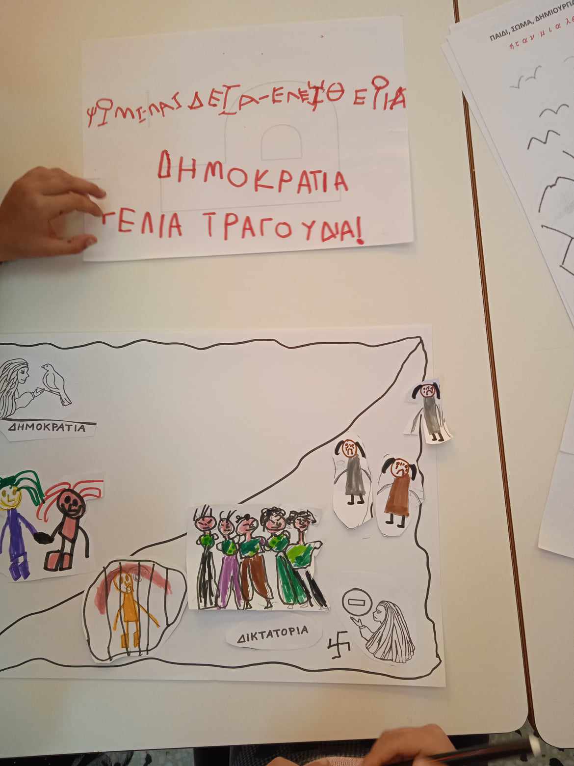 Τα γεγονότα του Πολυτεχνείου μας δίνουν την ευκαιρία να μιλήσουμε για την έννοια της Δημοκρατίας και του σεβασμού των ανθρωπίνων δικαιωμάτων. Για τον όμορφο αγώνα που έδωσαν οι φοιτητές μας κατά της χούντας, ο οποίος ήταν η αρχή για το τέλος της. Για το σκοπό αυτό χρησιμοποιούμε το πλούσιο υλικό που υπάρχει στο ΙΝΤΕΡΝΕΤ ,τραγούδια, πολύ ωραία βιβλία, κατάλληλα για την ηλικία των παιδιών μας, που προσφέρονται για κουκλοθέατρο, δραματοποίηση και συζήτηση.Φέτος ξεκινήσαμε με με αυτό το τραγούδι