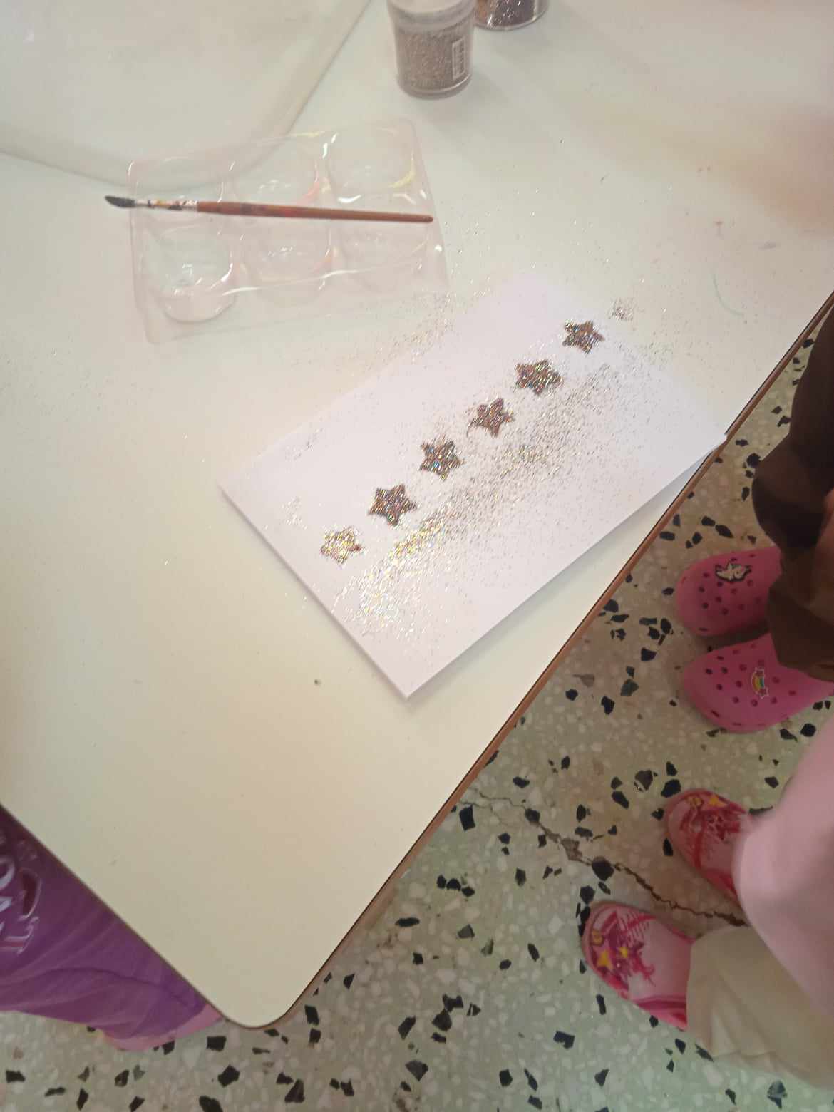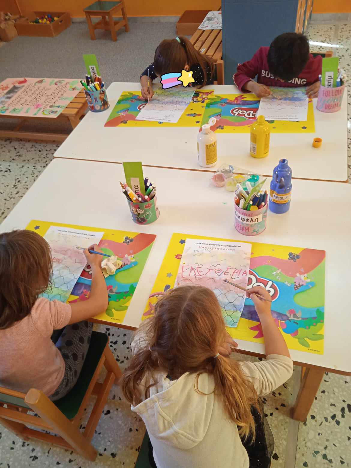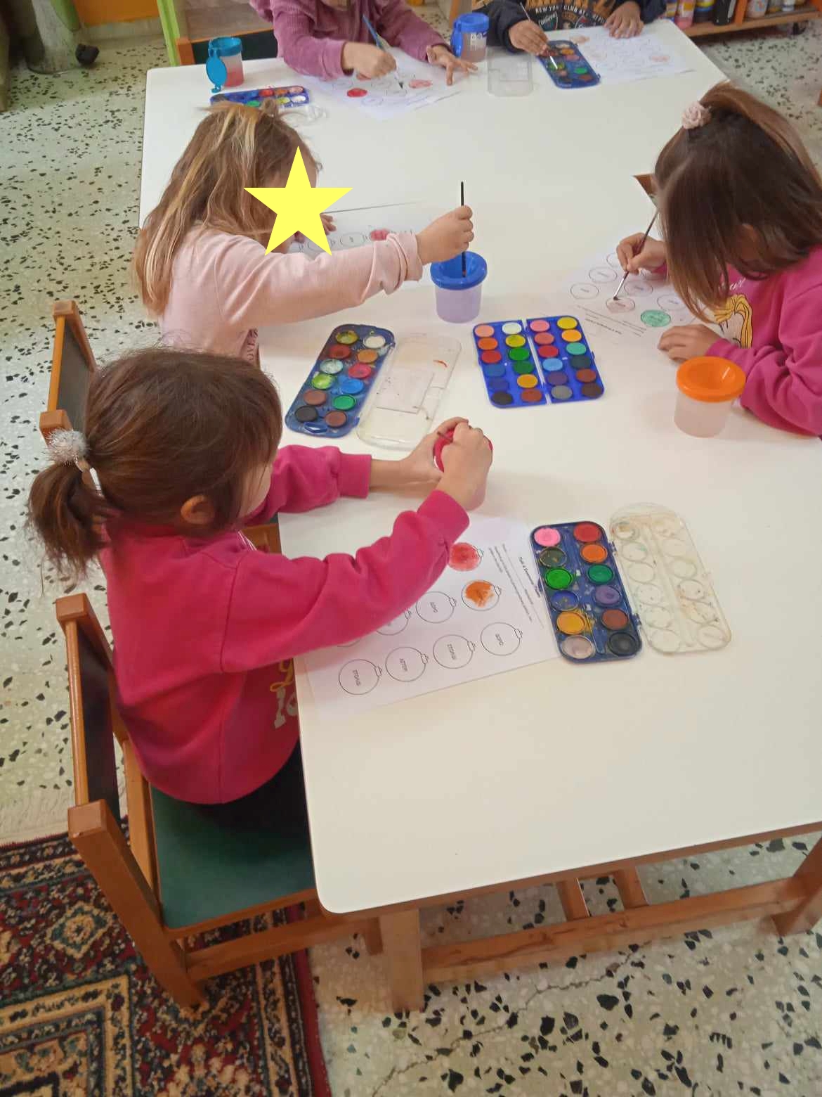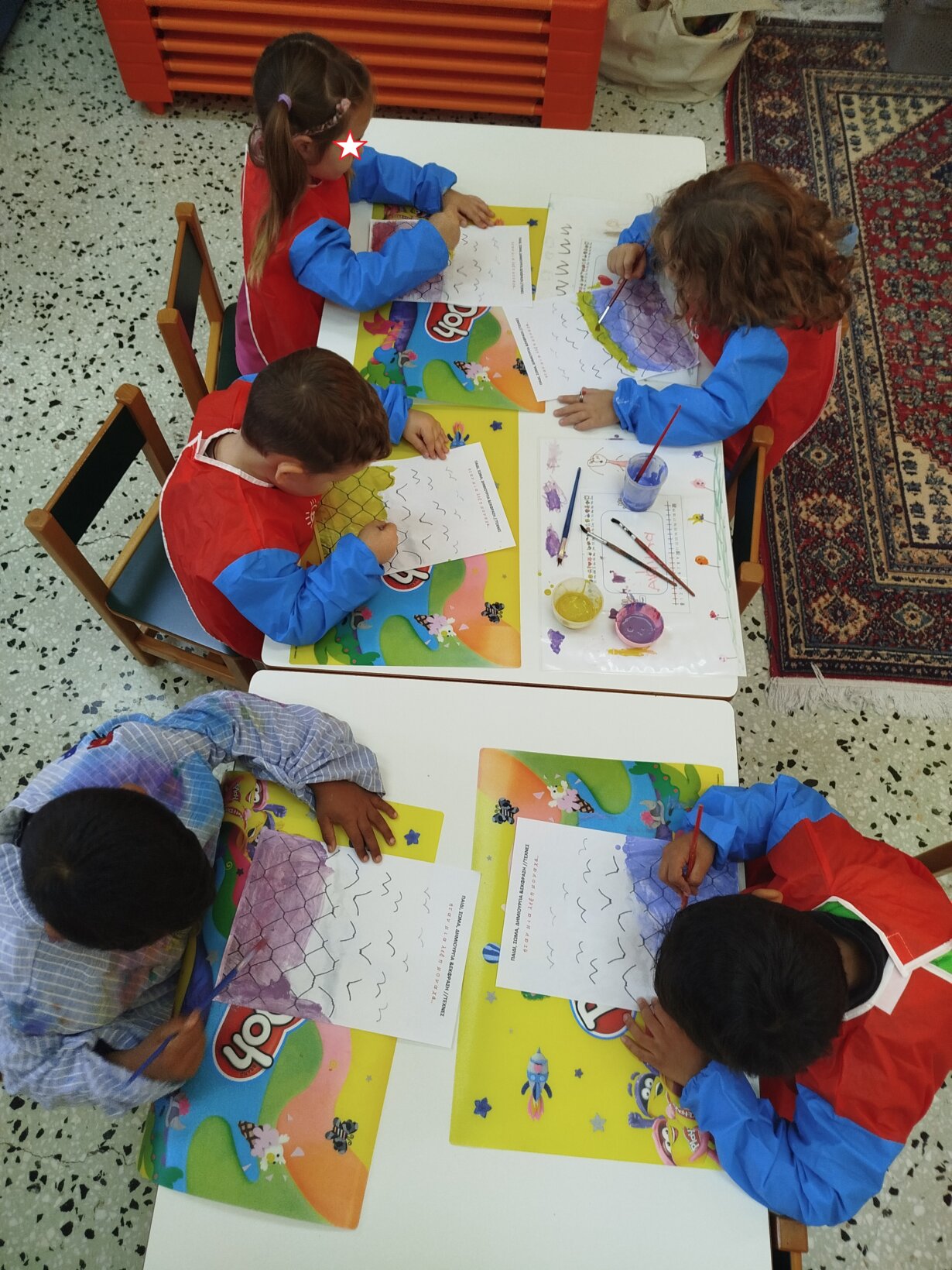 Χρησιμοποιήσαμε νερομπογιές και σφουγγαράκι για το “σβήσιμο”. Στο τέλος πάντα καθαρίζουμε!