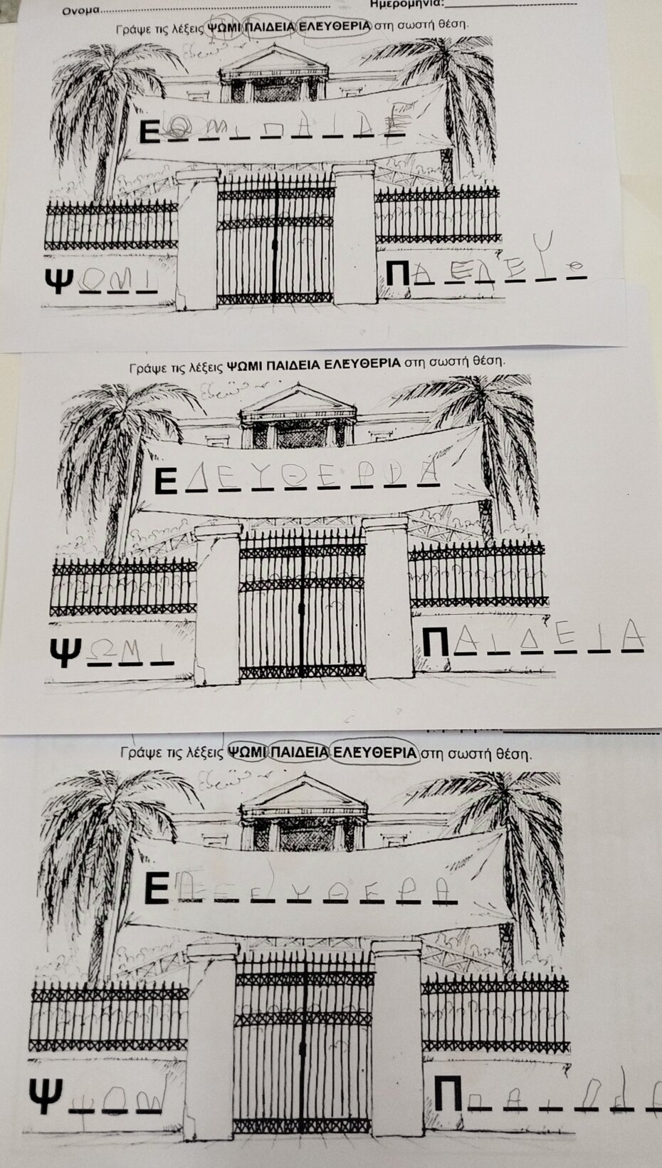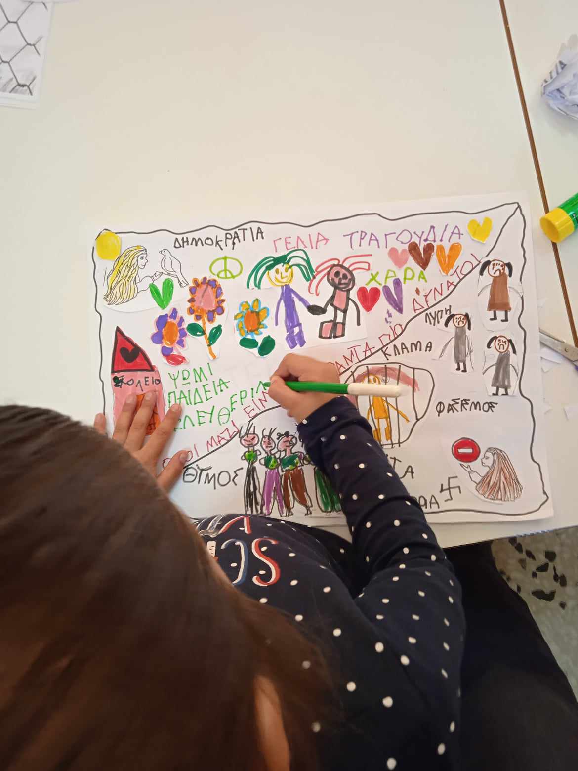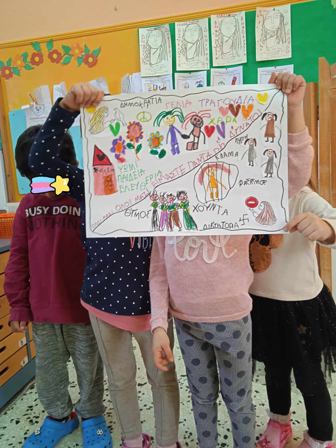 Γνωρίσαμε μέσα από αφήγηση τα γεγονότα της 17 Νοέμβρη, τι σημαίνει η λέξη “φοιτητές”, ποιο είναι το Πολυτεχνείο, τι είναι τα πανό με τα συνθήματα, πώς είναι η πύλη και η πρόσοψη του Πολυτεχνείου. Ακούσαμε το τραγούδι “Σώπα όπου να ‘ναι θα σημάνουν οι καμπάνες” και γνωρίσαμε το Μίκη Θεοδωράκη, τον σπουδαίο συνθέτη που με τα τραγούδια του προωθούσε τις έννοιες της Λευτεριάς, της Δημοκρατίας, της Δικαιοσύνης.