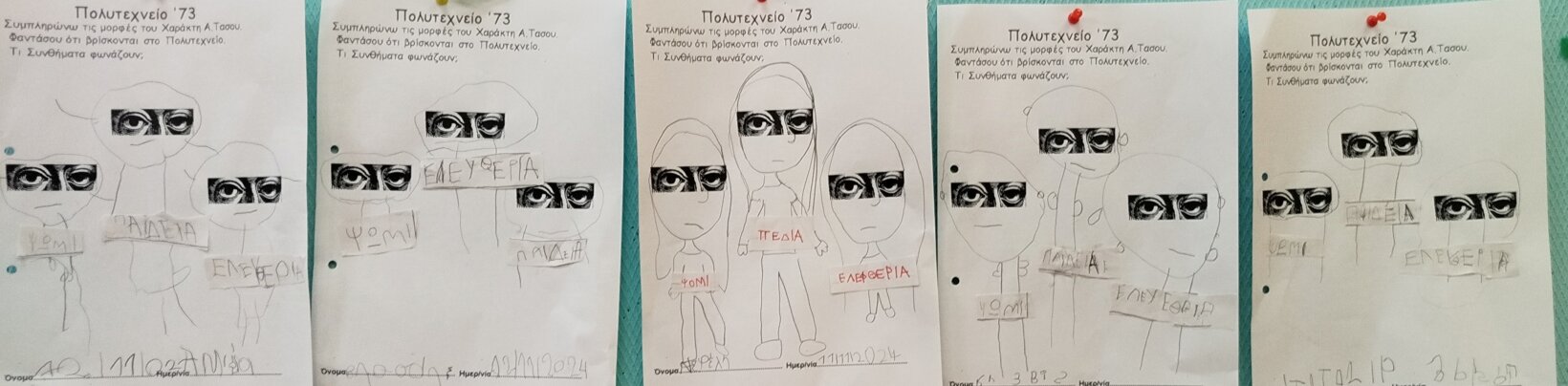 Μετά την διήγηση των γεγονότων του Πολυτεχνείου, την ενασχόλησή μας με την έννοια της δημοκρατίας και της δικτατορίας γνωρίσαμε την τέχνη της χαρακτικής και έναν πολύ γνωστού Έλληνα χαράκτη, τον Τάσσο (κατά κόσμον Αναστάσιος Αλεβίζος). Παρατηρήσαμε τις μορφές των ανθρώπων, τις έντονες γραμμές σε μαύρο χρώμα, τα έντονο βλέμμα. Μιλήσαμε για τα συναισθήματα απόγνωση , φόβο αλλά και ελπίδα που διακρίναμε στα πρόσωπα ! Στη συνέχεια συμπληρώσαμε την λεπτομέρεια του έργου φτιάχνοντας ένα σχετικό φύλλο εργασίας και ζωγραφίζοντας τους φοιτητές εκείνης της εποχής με την τεχνοτροπία ( γραμμές, χαρακτηριστικά προσώπου) του Τάσσου.
