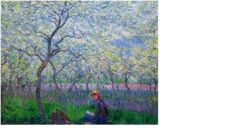 Ο πίνακας του Κλωντ Μονέ (Claude Oscar Monet) «Περιβόλι την άνοιξη». Παρατηρήστε τη φύση, τα δέντρα… Τι έχει δίπλα της το κορίτσι; Ζωγραφίστε εσείς στη συνέχεια τον πίνακα όπως μπορείτε και προσθέστε ότι άλλο φαντάζεστε, ότι θα θέλατε να υπάρχει στον πίνακα αν εσείς ήσασταν οι ζωγράφοι. Είμαστε σίγουρες πως θα έχετε καταπληκτικές ιδέες.