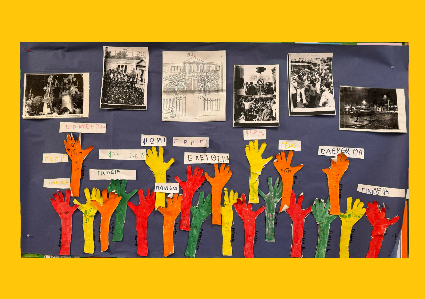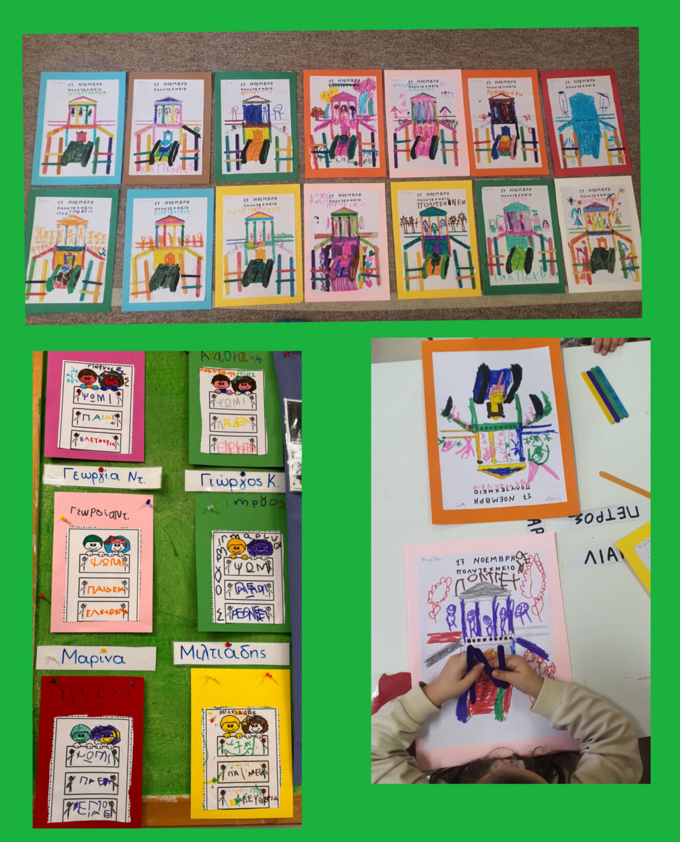 Με αφορμή την επέτειο του Πολυτεχνείου στις 17 Νοεμβρίου μάθαμε για τα γεγονότα εκείνων των ημερών , δημιουργήσαμε το δικό μας πανό με συνθήματα και φτιάξαμε όμορφες κατασκευές. Μέσα σε αυτές ήταν και οι ήρωες της ιστορίας «Η Ντενεκεδούπολη» την οποία παίξαμε σε κουκλοθέατρο!