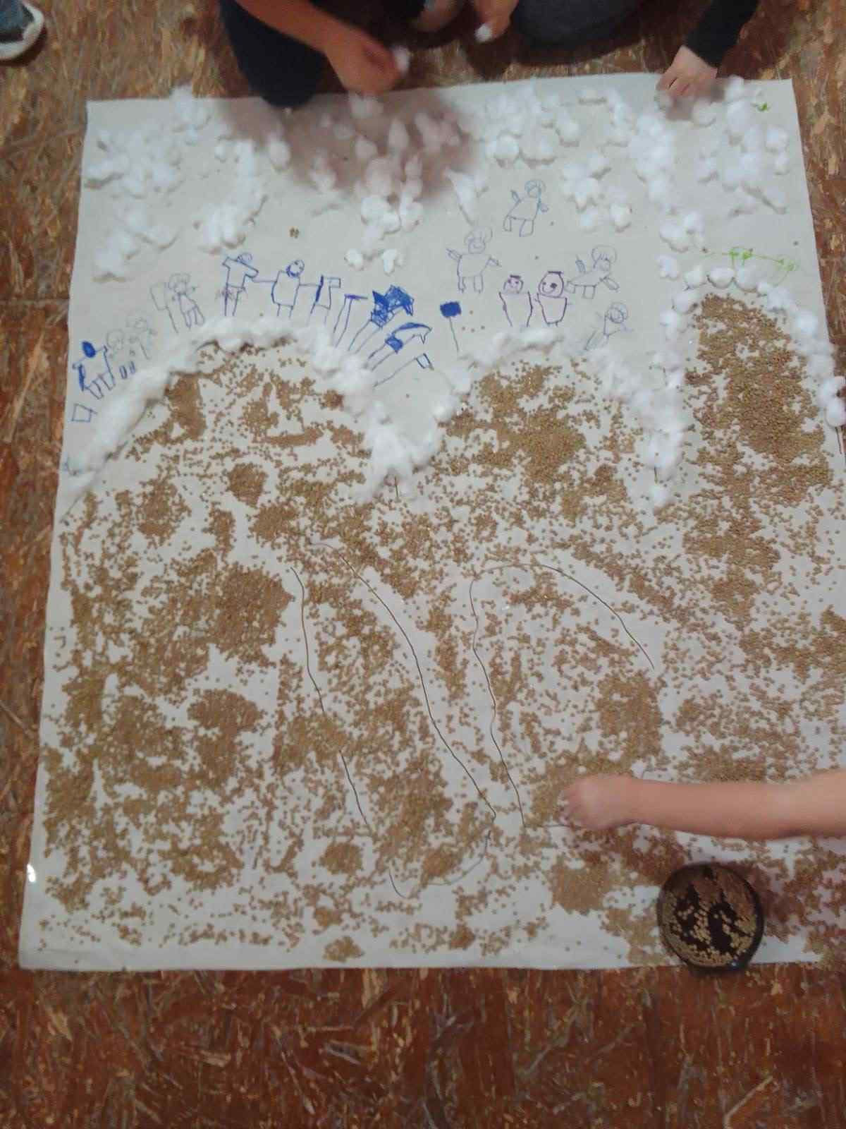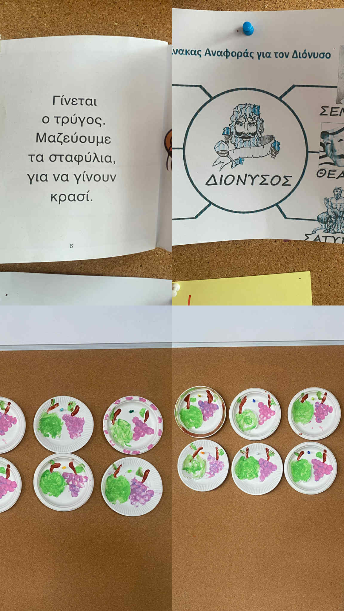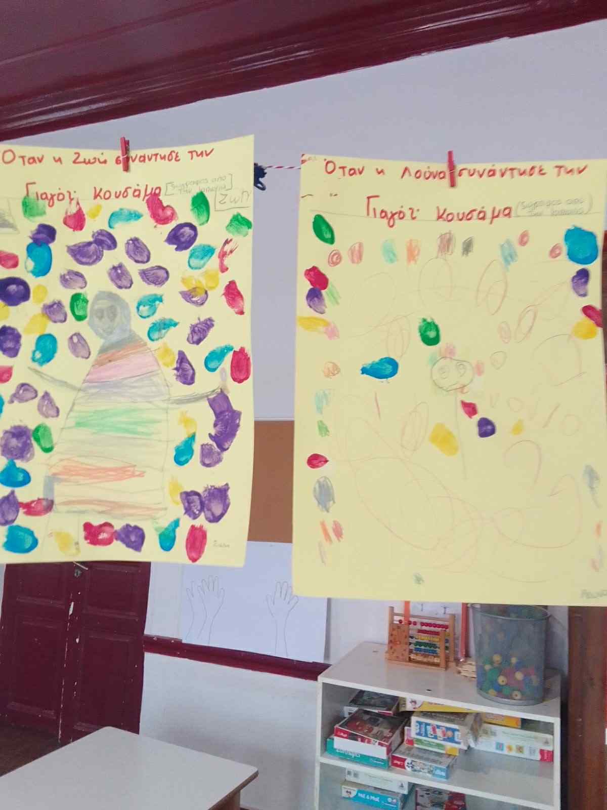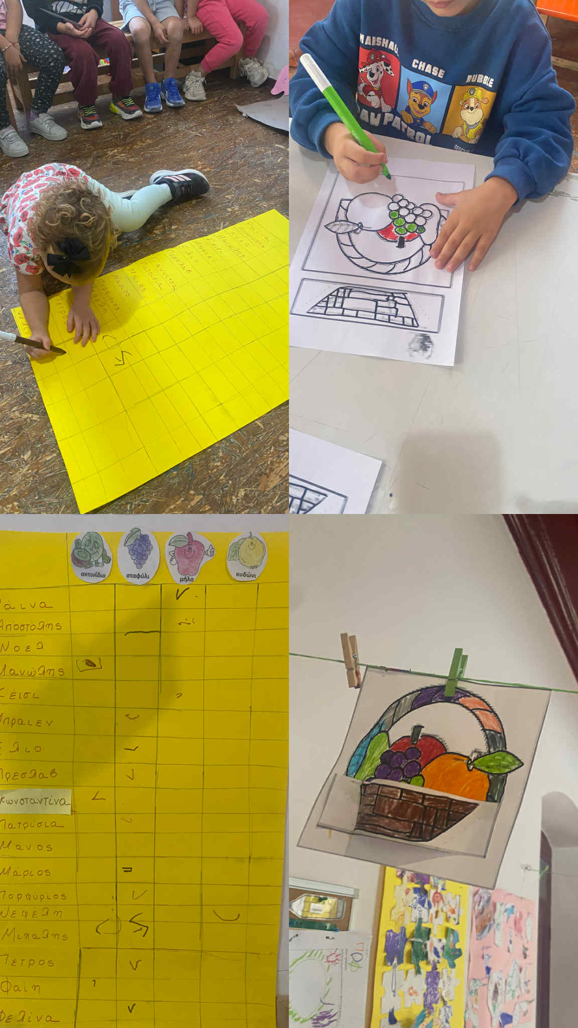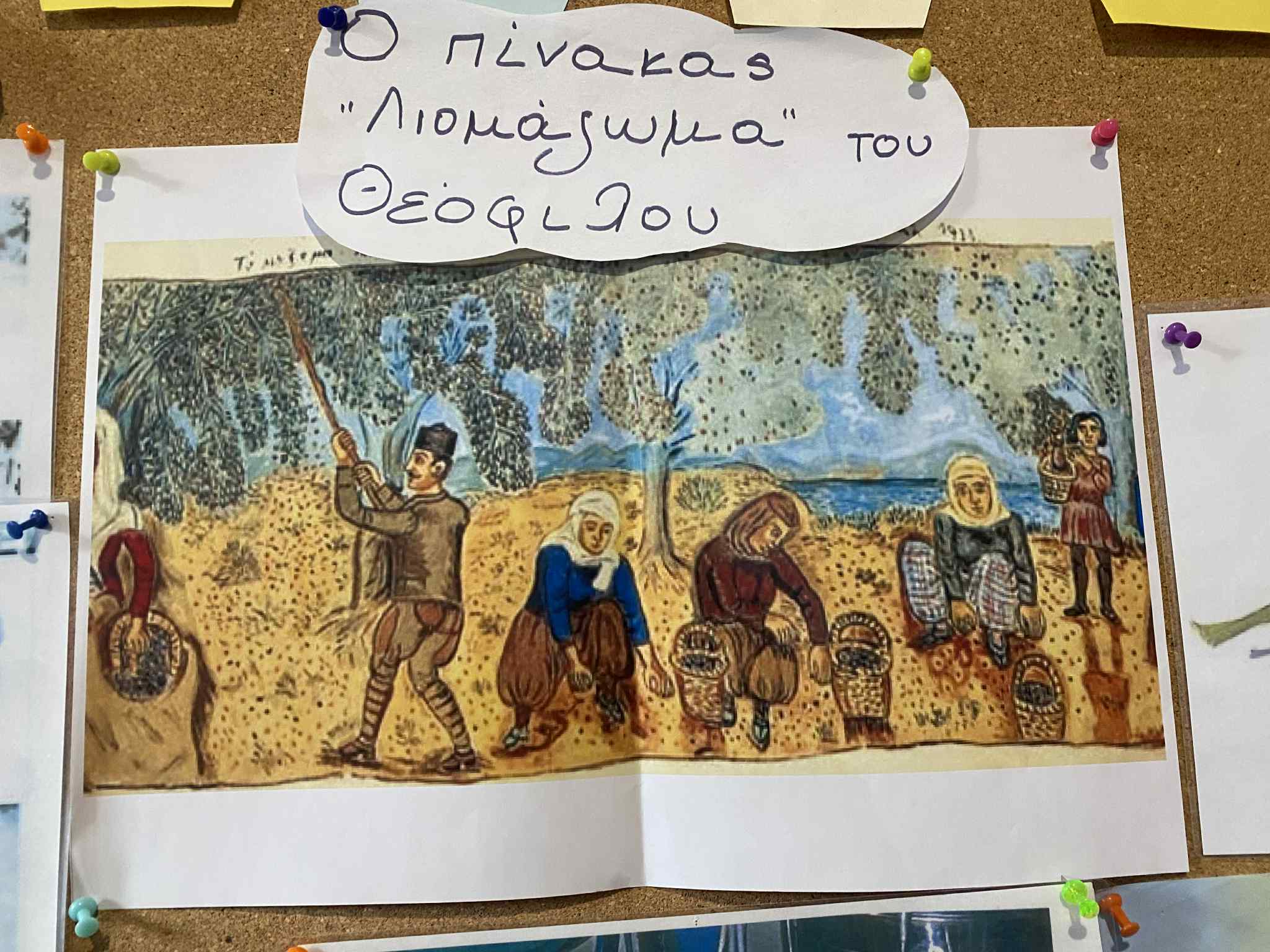 Στη συνέχεια, τα παιδιά επεξεργάστηκαν τον πίνακα του Θεόφιλου «Λιομάζωμα». Παρατήρησαν τις φορεσιές των ανθρώπων, τι χρησιμοποιούν για το λιομάζωμα και μέτρησαν τις φιγούρες στον πίνακα. Αναπαρέστησαν τον πίνακα με το σώμα τους, με το κάθε παιδί να αναλαμβάνει έναν διαφορετικό ρόλο. Ακολούθως, μέσα από μια ομαδική δουλειά, τα παιδιά δημιούργησαν σε μεγάλο χαρτόνι τον πίνακα του Θεόφιλου, με πρωταγωνιστές τα ίδια.