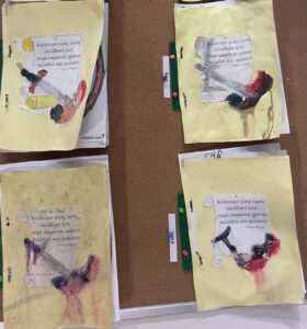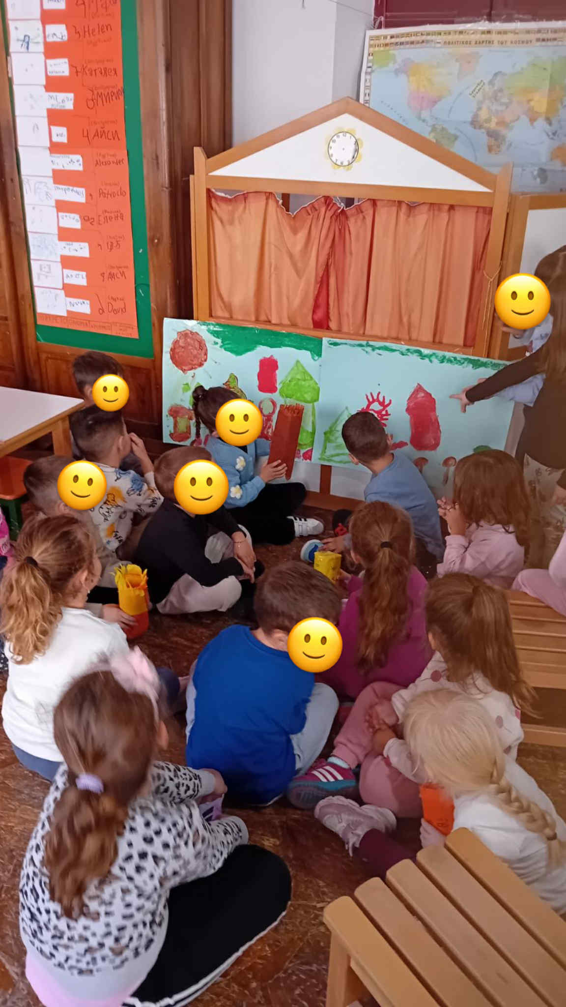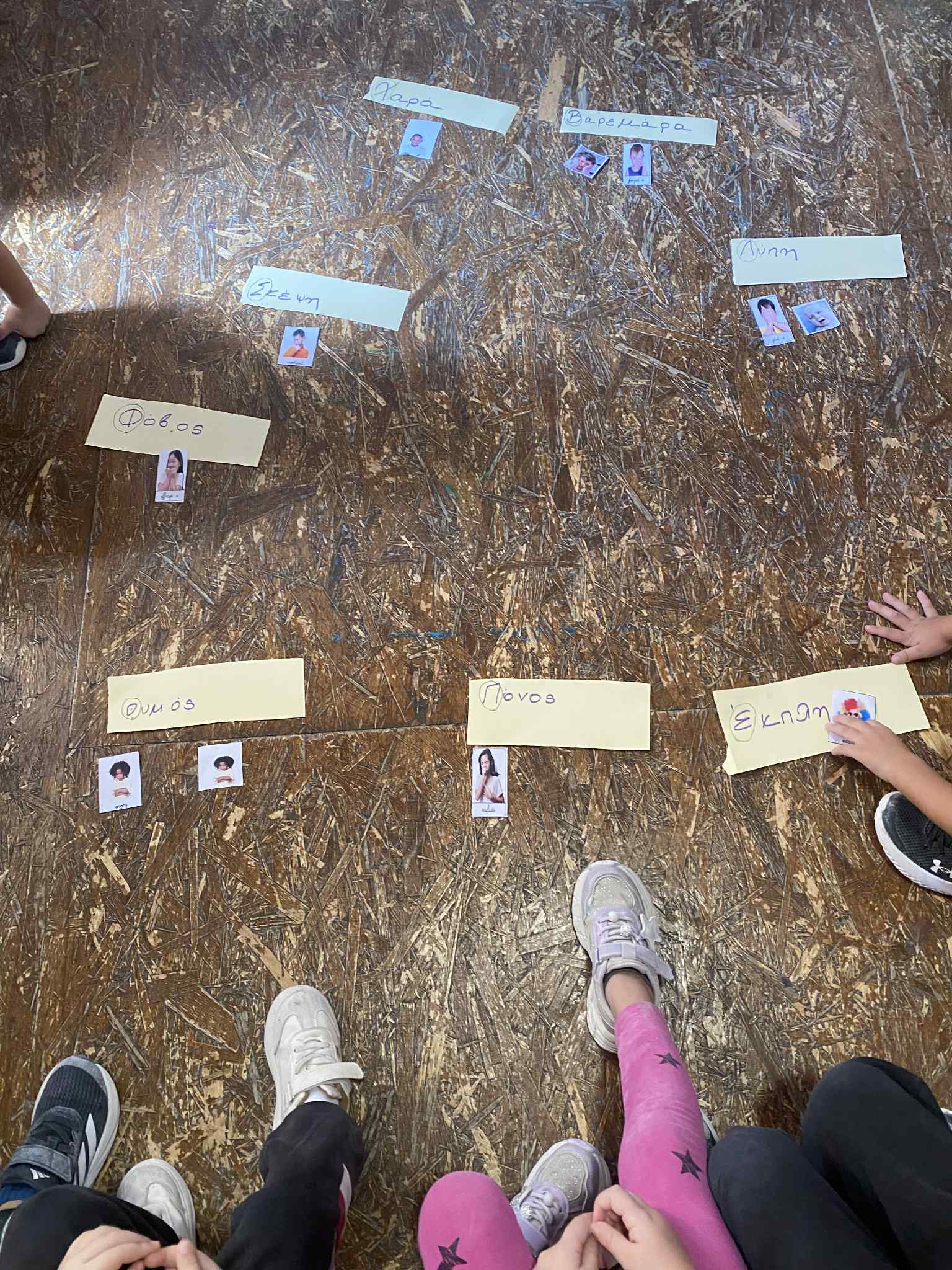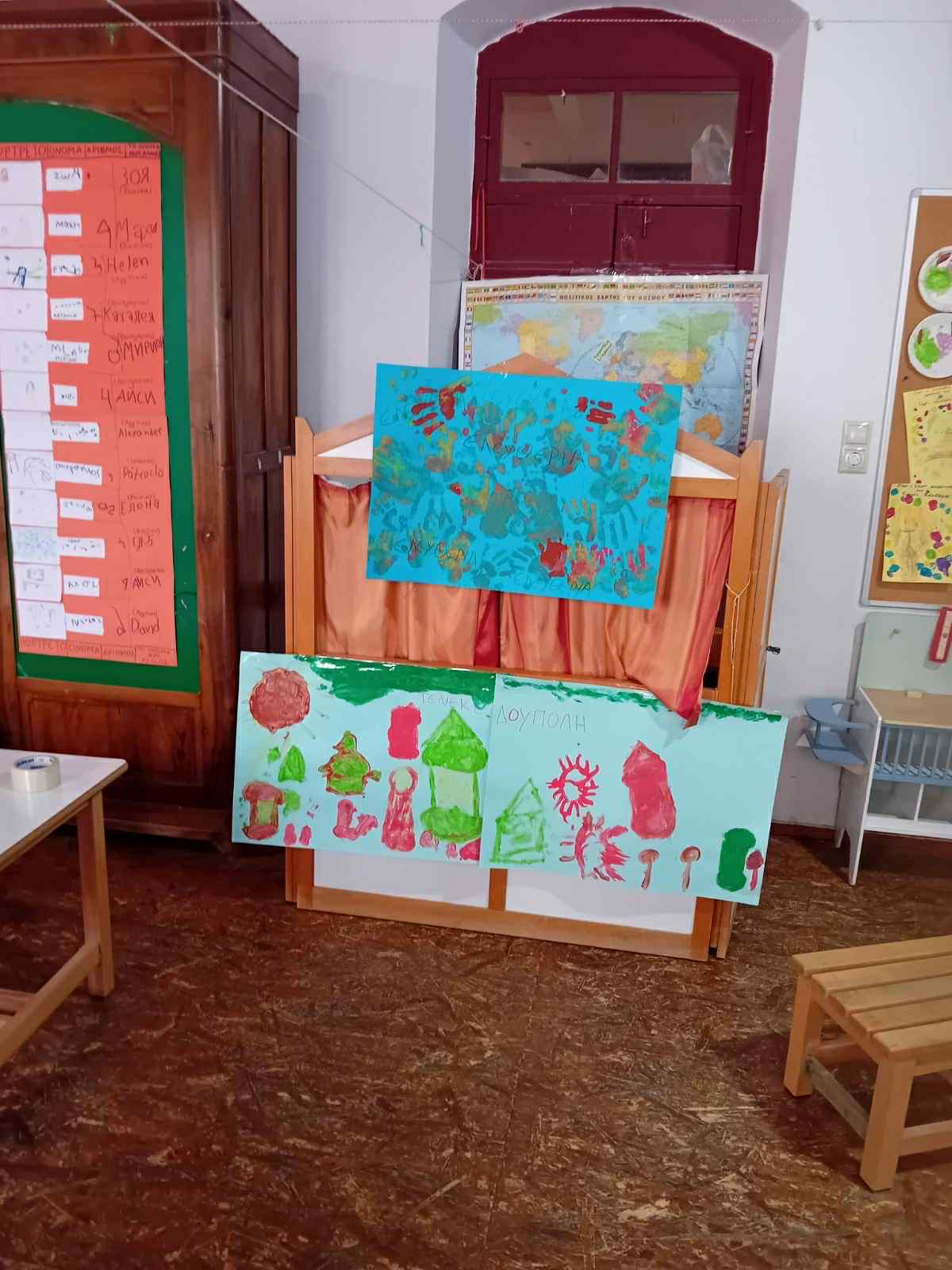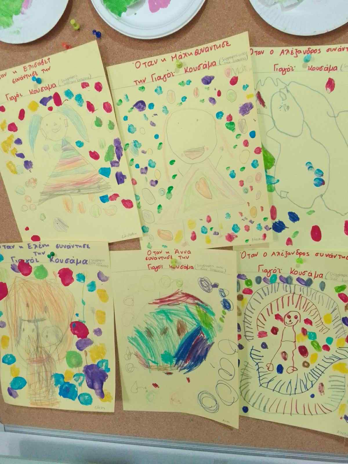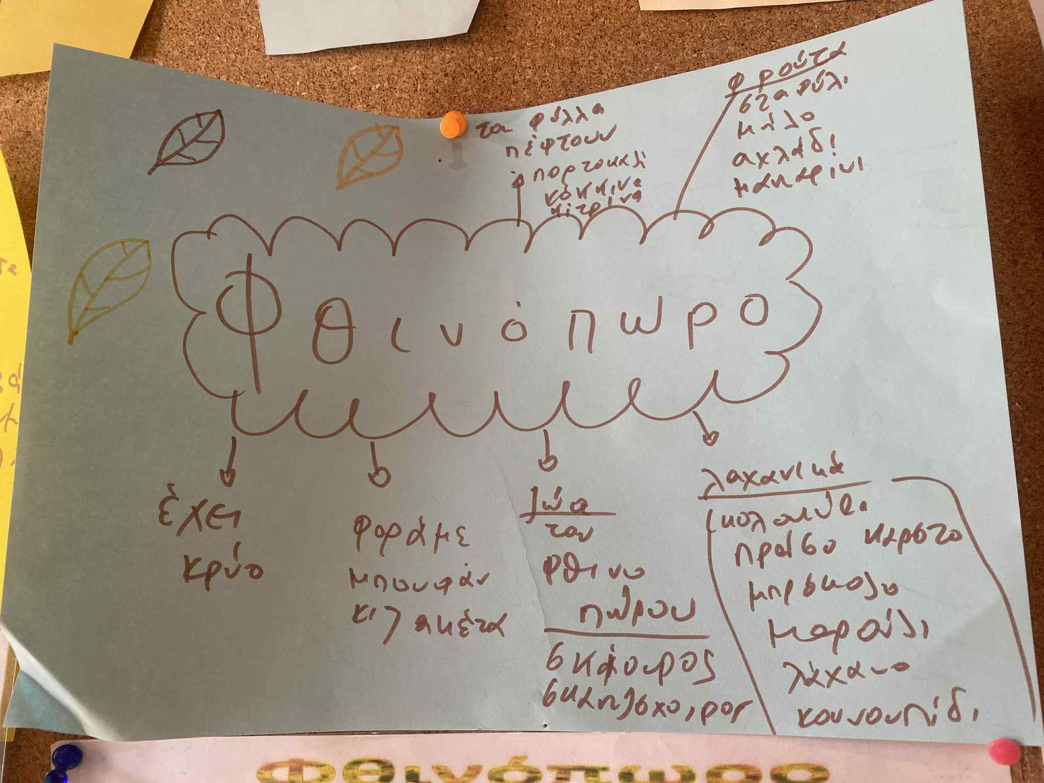 Στη συνέχεια, τα παιδιά επεξεργάστηκαν τον πίνακα του Θεόφιλου «Λιομάζωμα». Παρατήρησαν τις φορεσιές των ανθρώπων, τι χρησιμοποιούν για το λιομάζωμα και μέτρησαν τις φιγούρες στον πίνακα. Αναπαρέστησαν τον πίνακα με το σώμα τους, με το κάθε παιδί να αναλαμβάνει έναν διαφορετικό ρόλο. Ακολούθως, μέσα από μια ομαδική δουλειά, τα παιδιά δημιούργησαν σε μεγάλο χαρτόνι τον πίνακα του Θεόφιλου, με πρωταγωνιστές τα ίδια.