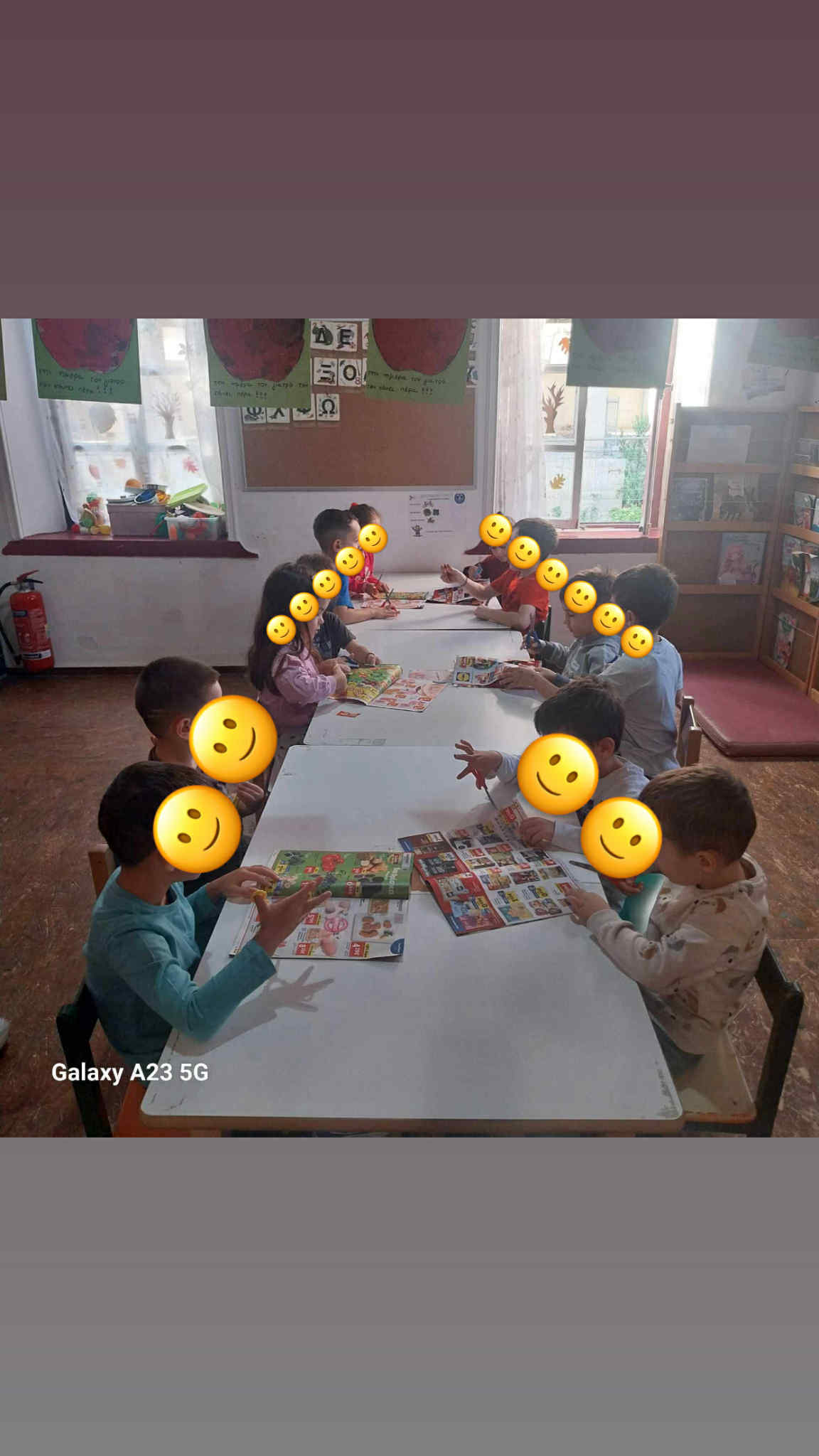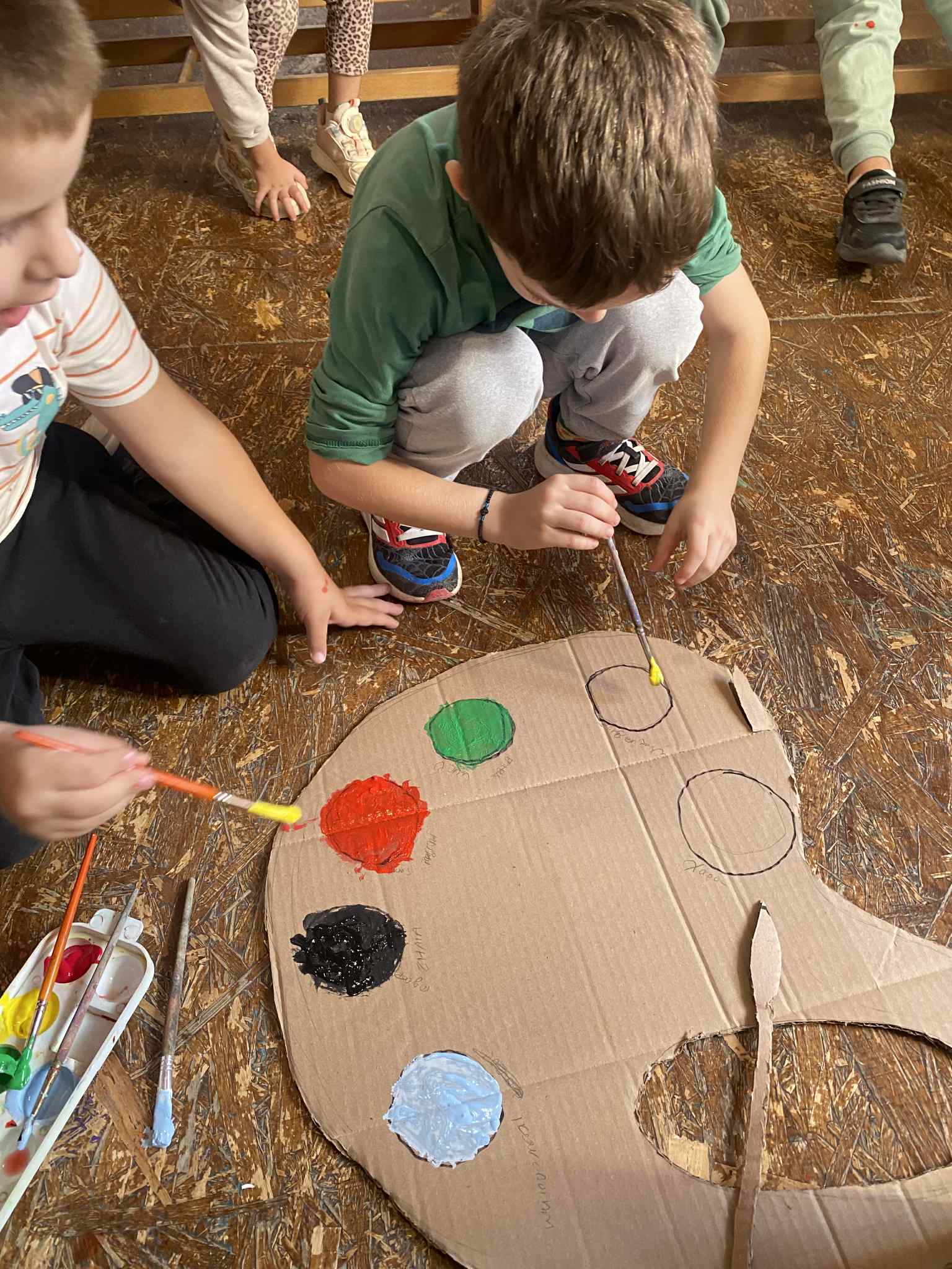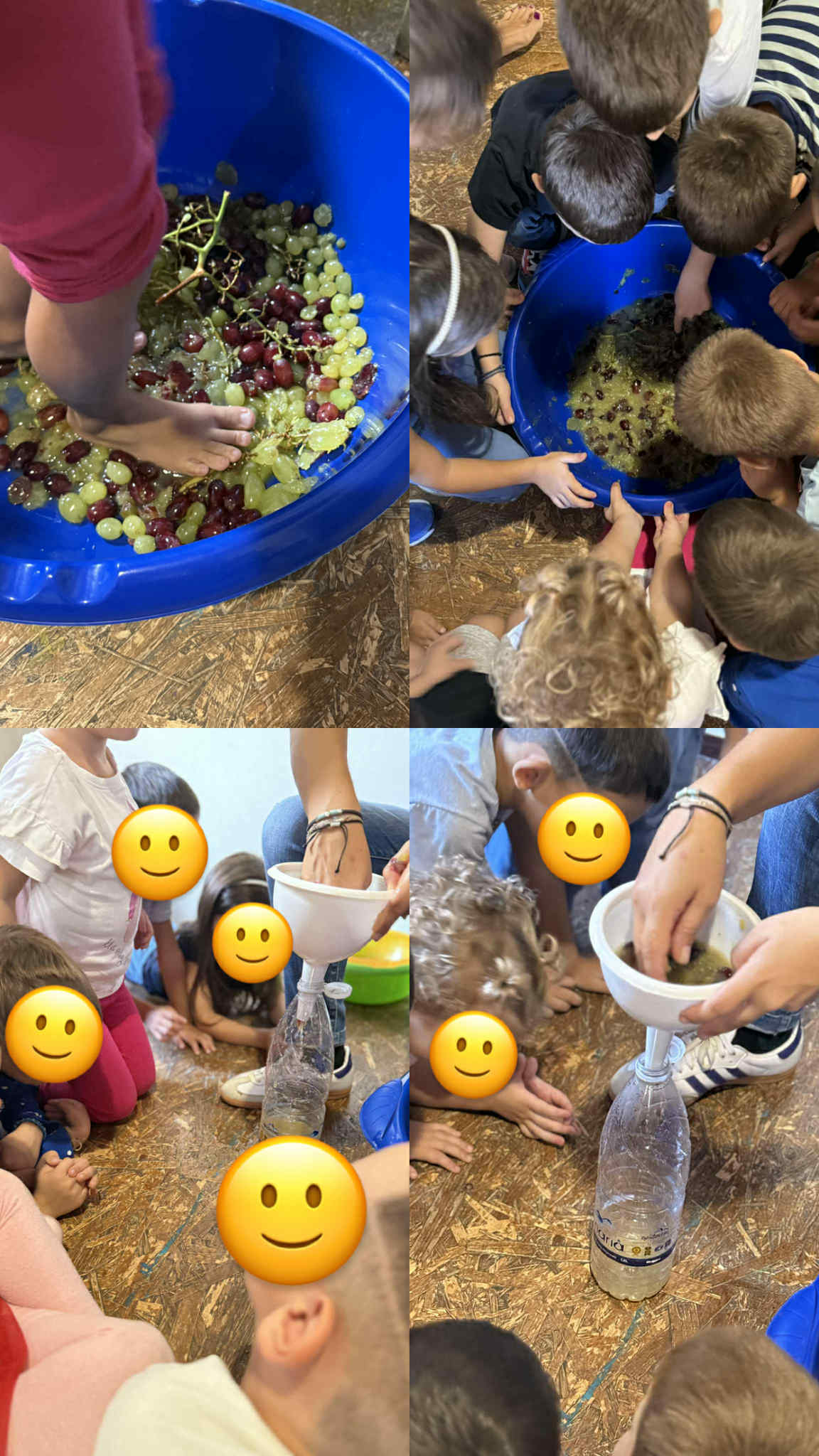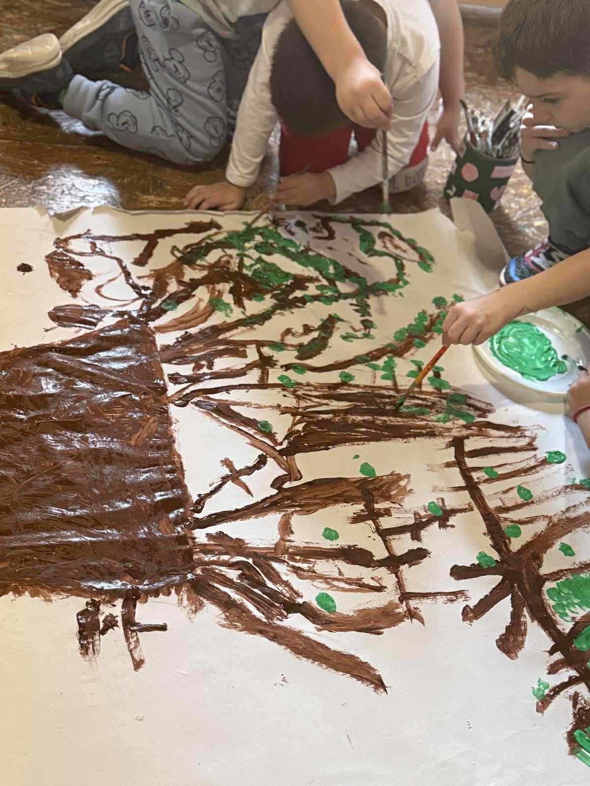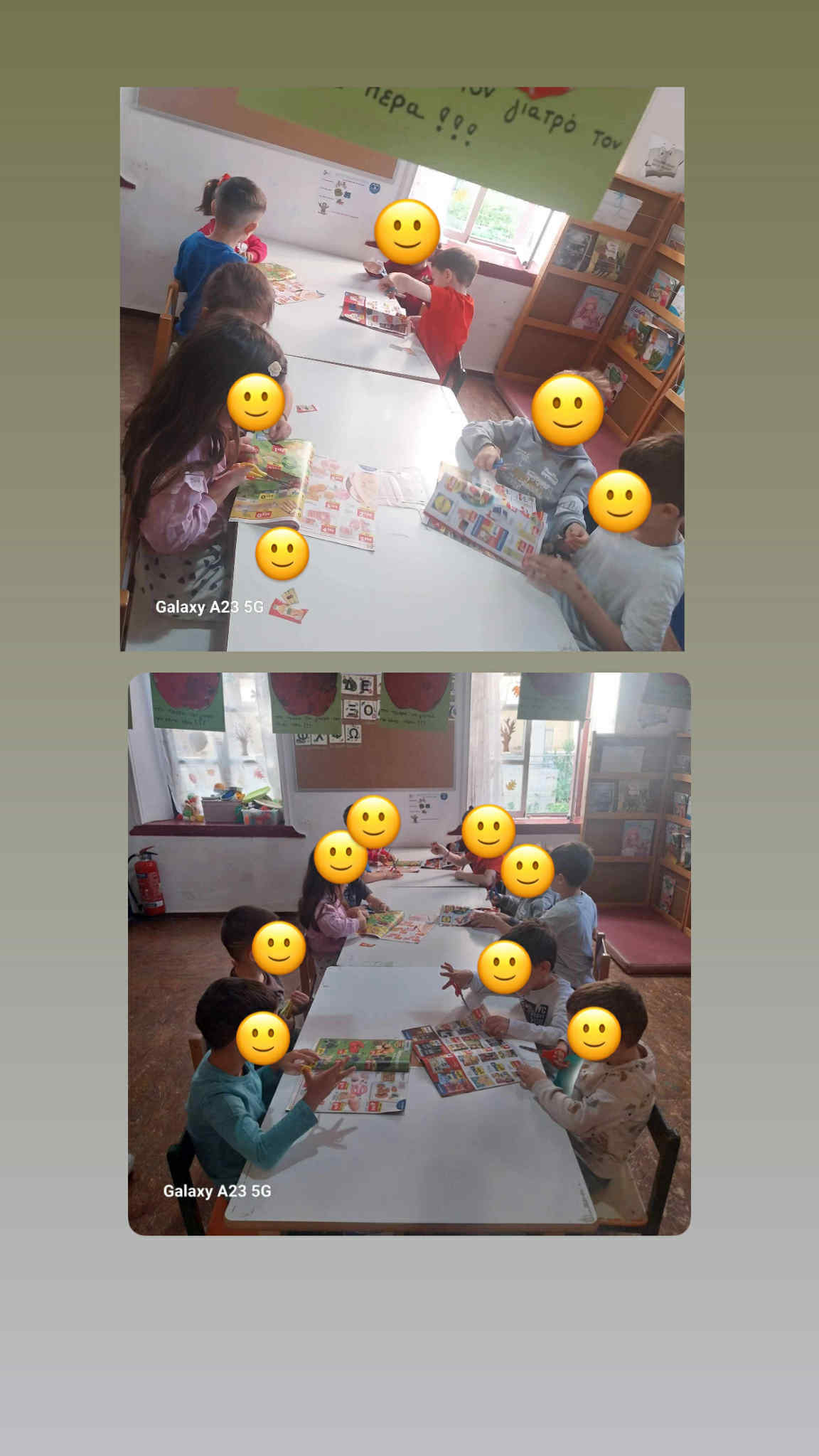 Στη συνέχεια, τα παιδιά επεξεργάστηκαν τον πίνακα του Θεόφιλου «Λιομάζωμα». Παρατήρησαν τις φορεσιές των ανθρώπων, τι χρησιμοποιούν για το λιομάζωμα και μέτρησαν τις φιγούρες στον πίνακα. Αναπαρέστησαν τον πίνακα με το σώμα τους, με το κάθε παιδί να αναλαμβάνει έναν διαφορετικό ρόλο. Ακολούθως, μέσα από μια ομαδική δουλειά, τα παιδιά δημιούργησαν σε μεγάλο χαρτόνι τον πίνακα του Θεόφιλου, με πρωταγωνιστές τα ίδια.